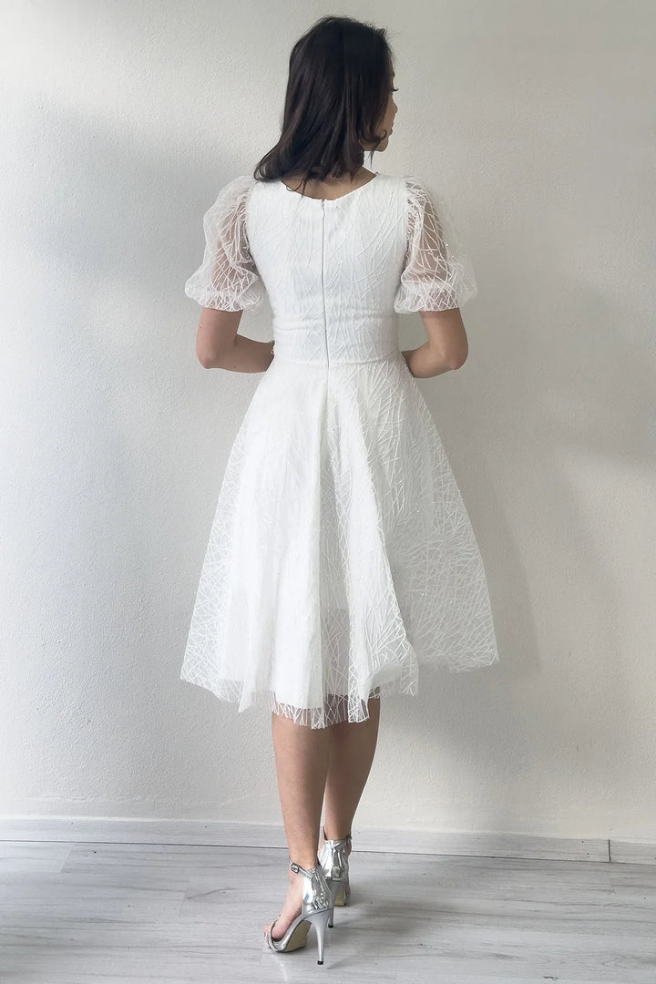 Beyaz Balon Kol Simli Kloş Midi Boy Abiye Elbise