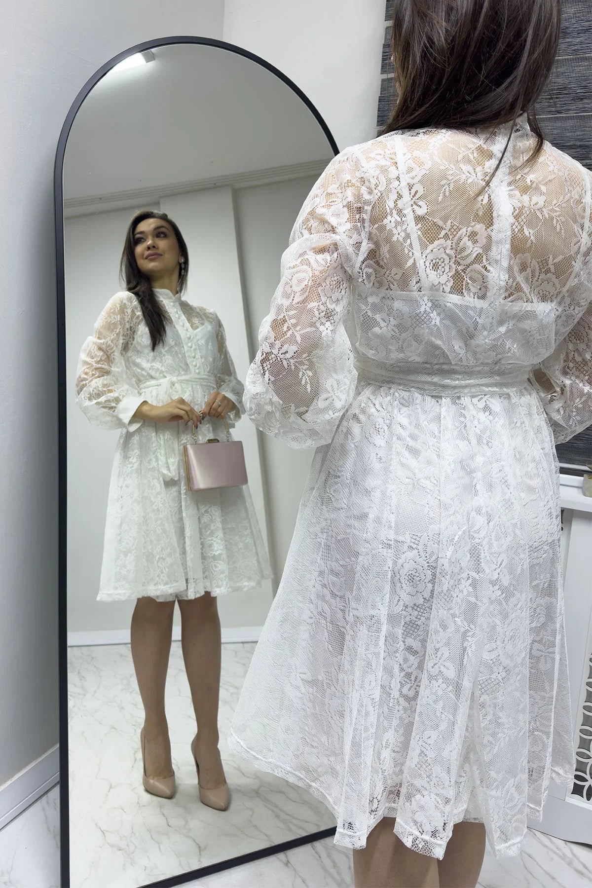 Beyaz Çan Fransız Güpür Düğmeli Büyük Beden Abiye Elbise