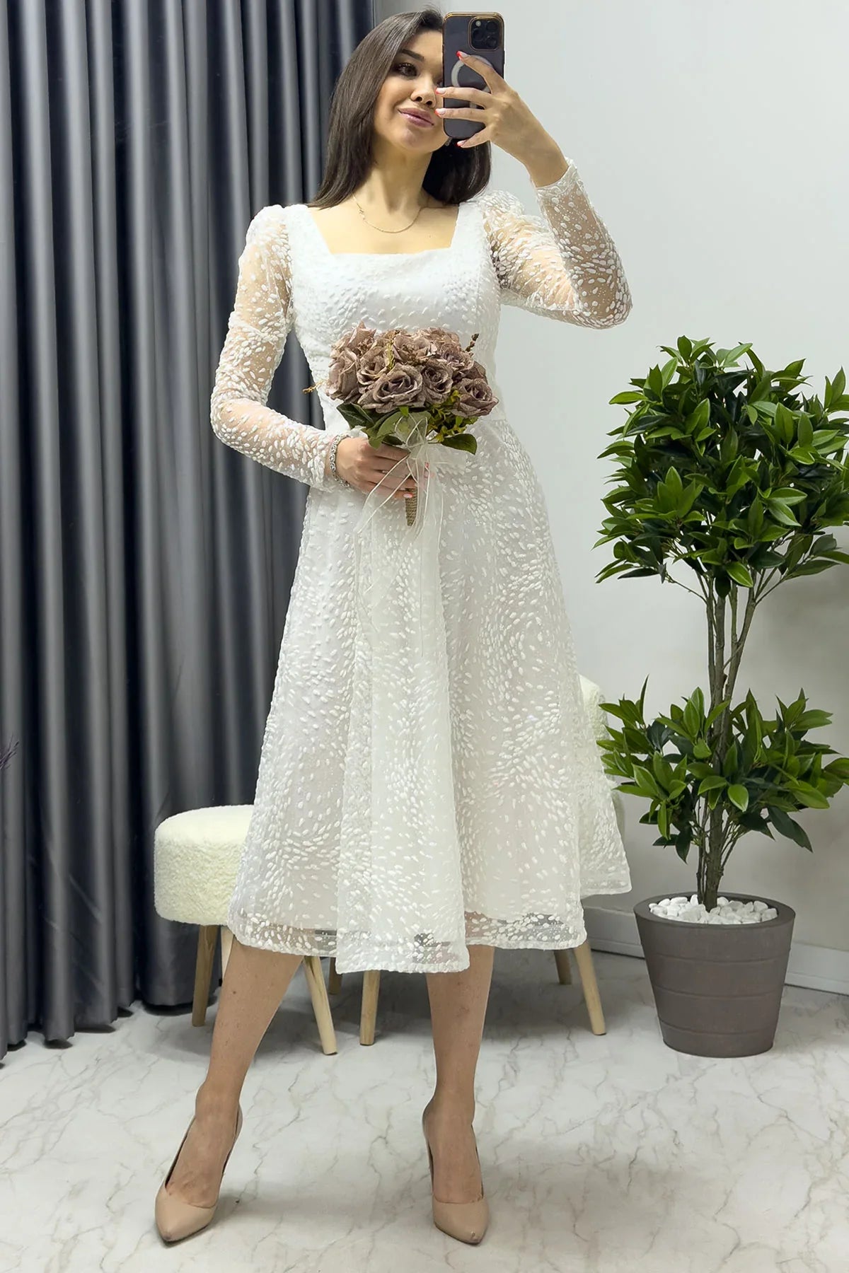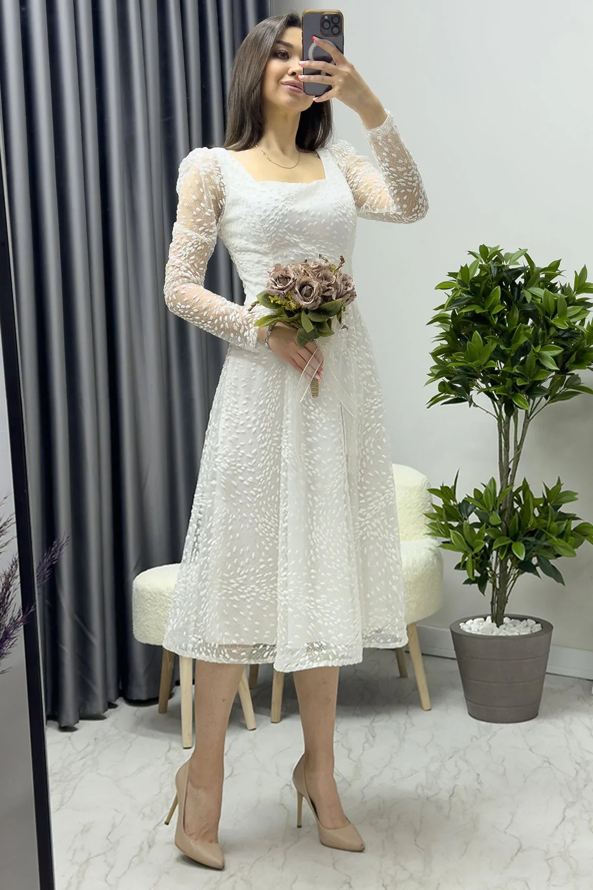 Beyaz Kare Yaka Nakışlı Kloş Abiye Elbise