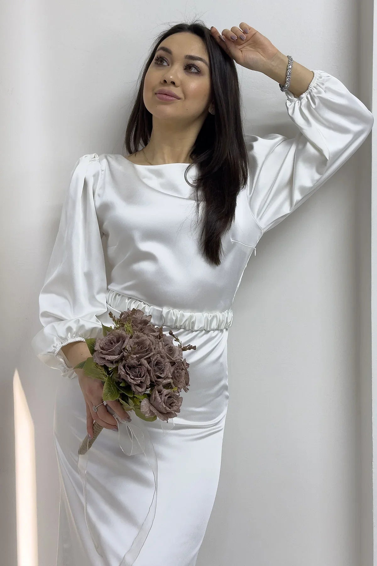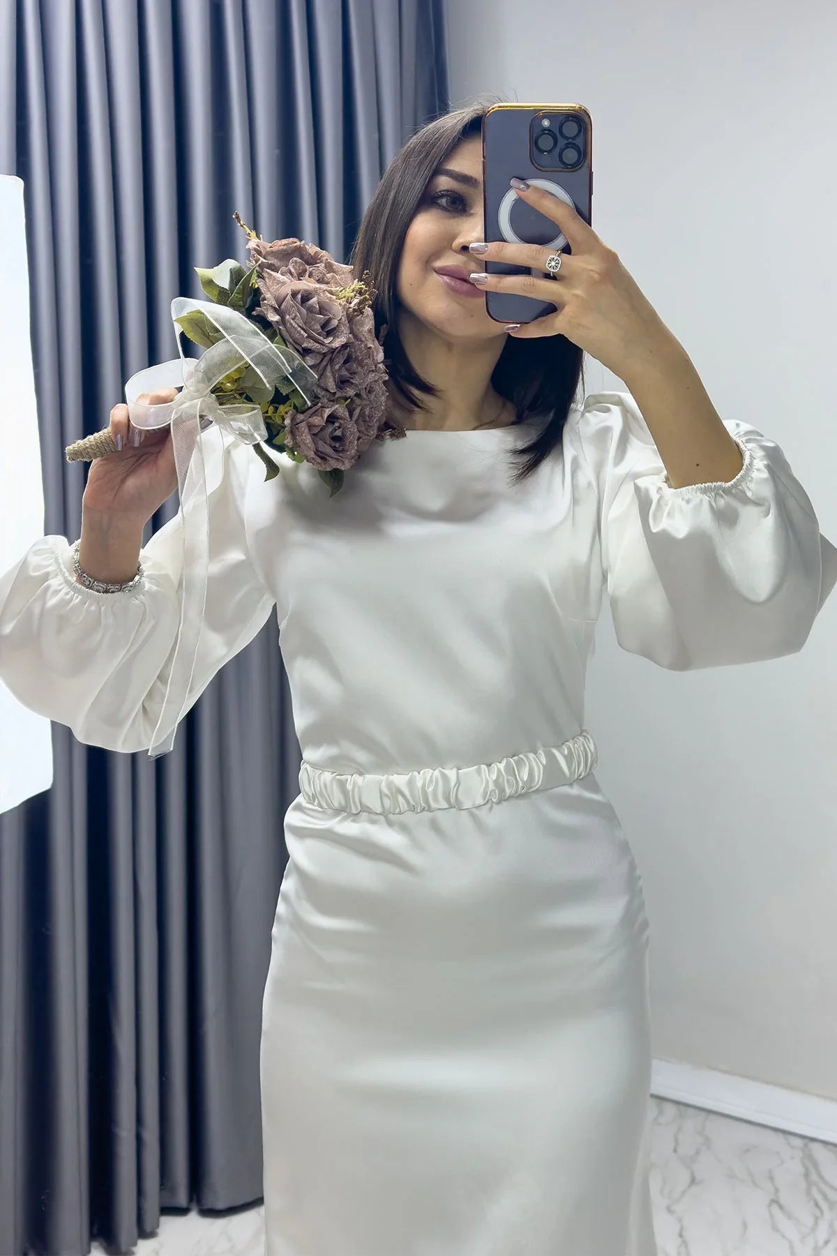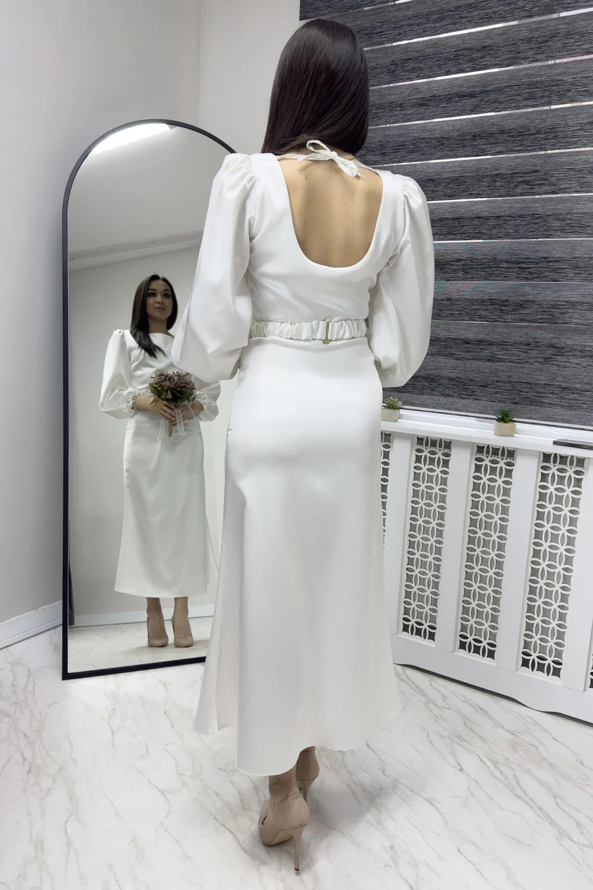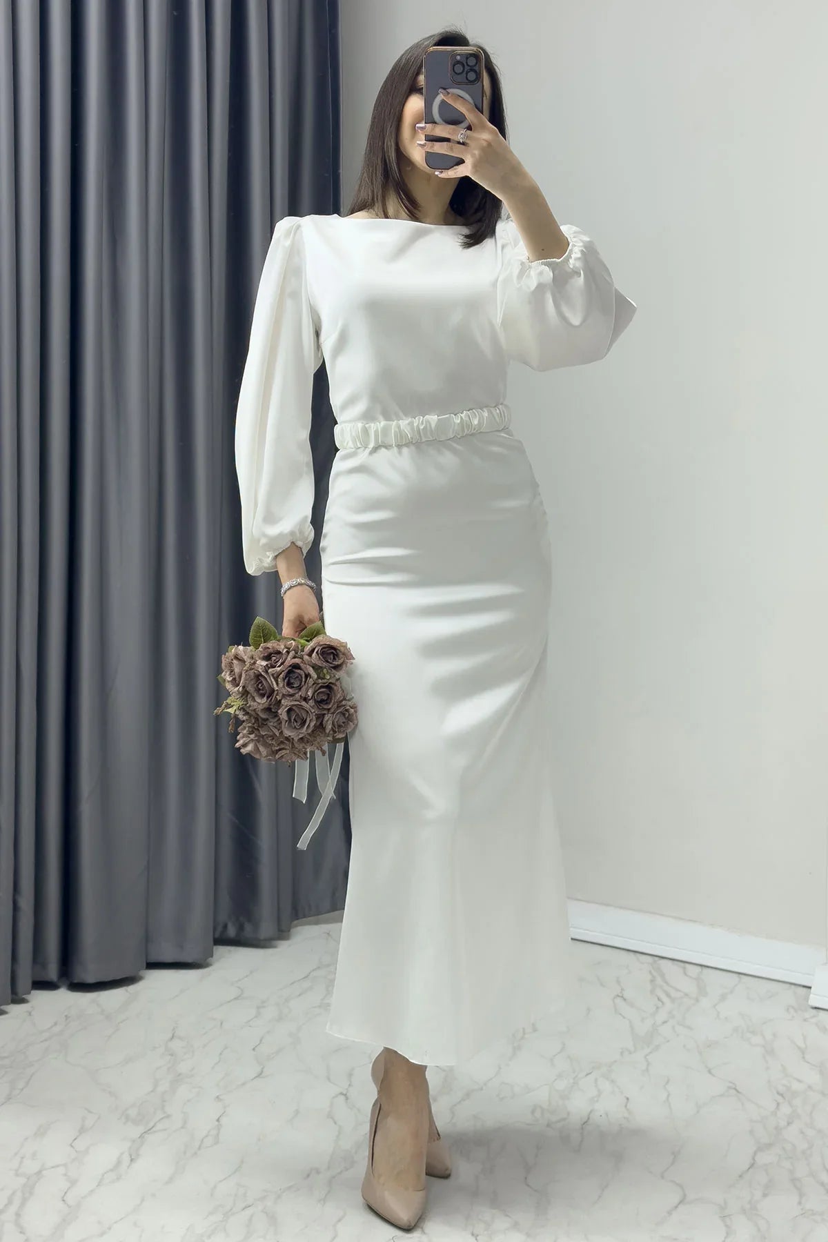 Beyaz Kemerli Balon Kol Midi Saten Büyük Beden Abiye Elbise