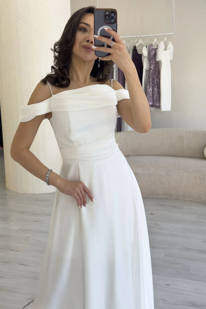 Beyaz Taş Askılı Düşük Omuz Saten Yırtmaçlı Abiye Elbise