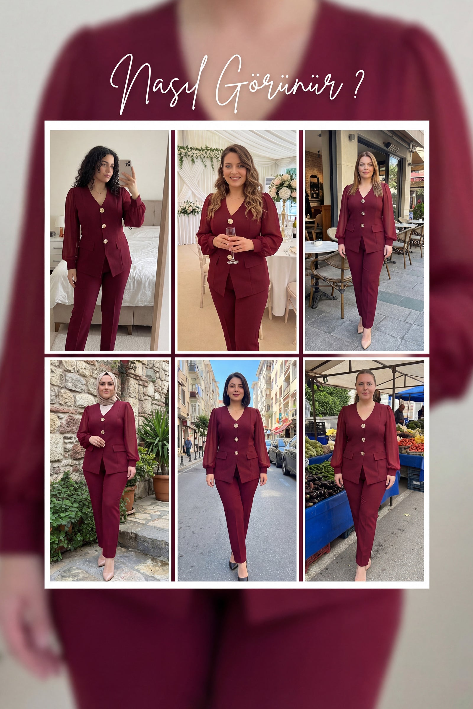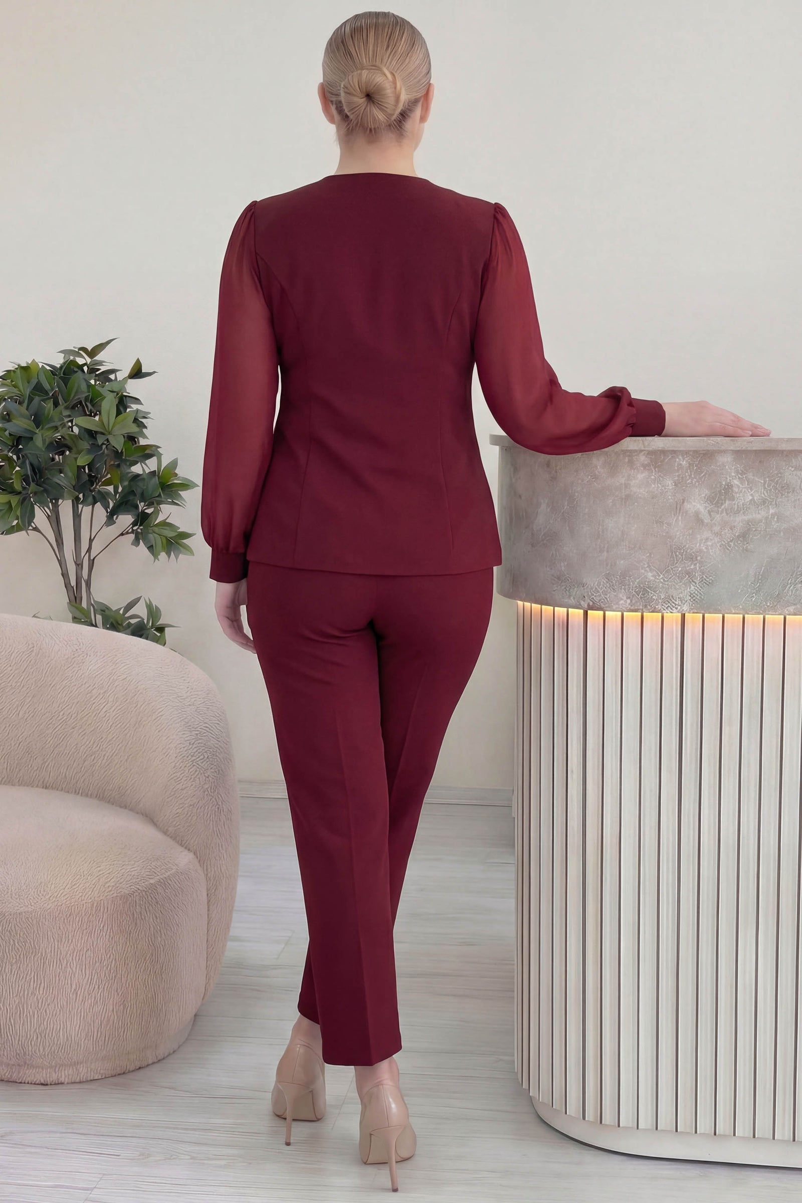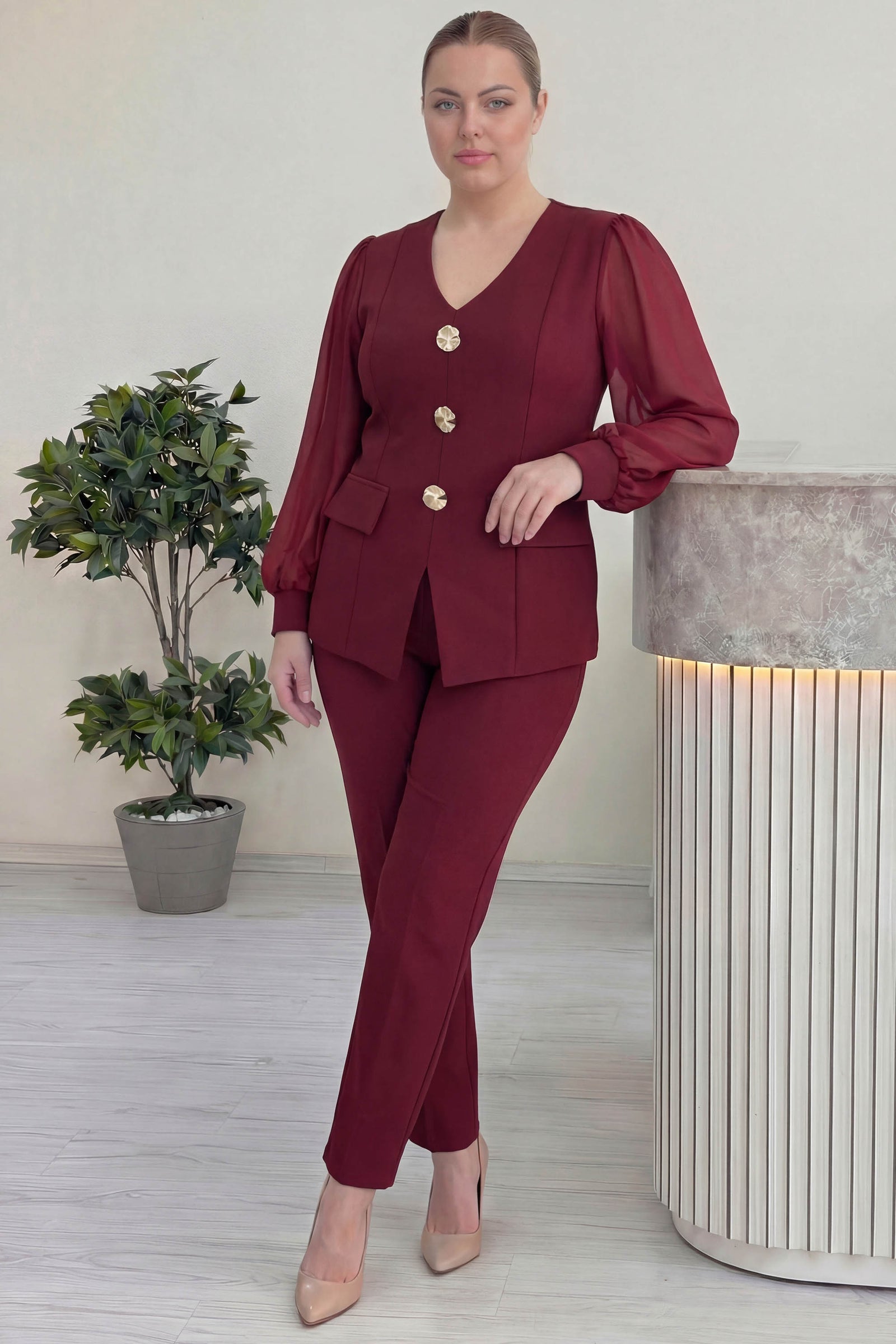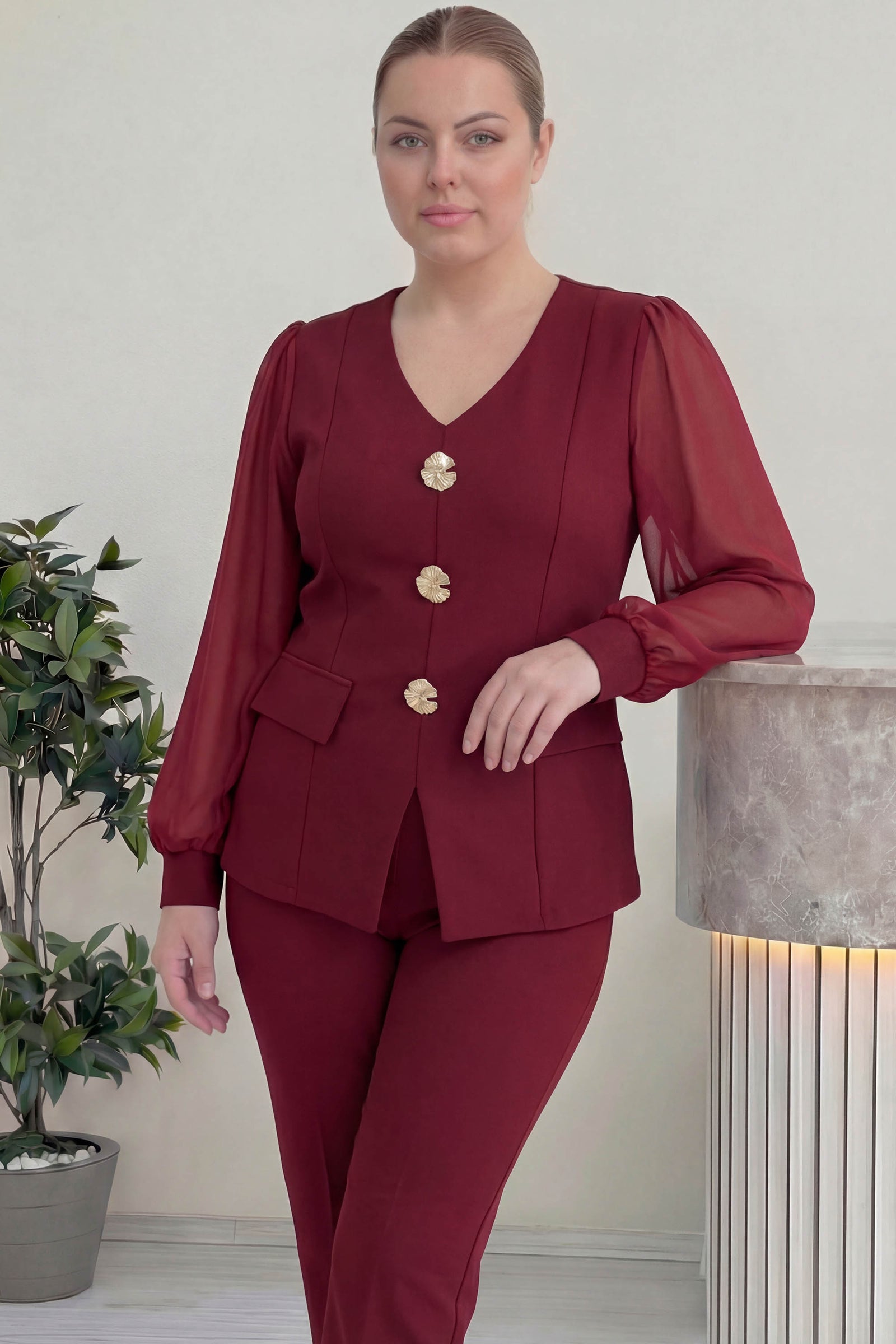Bordo Gold Düğmeli Şifon Kol Büyük Beden İkili Takım