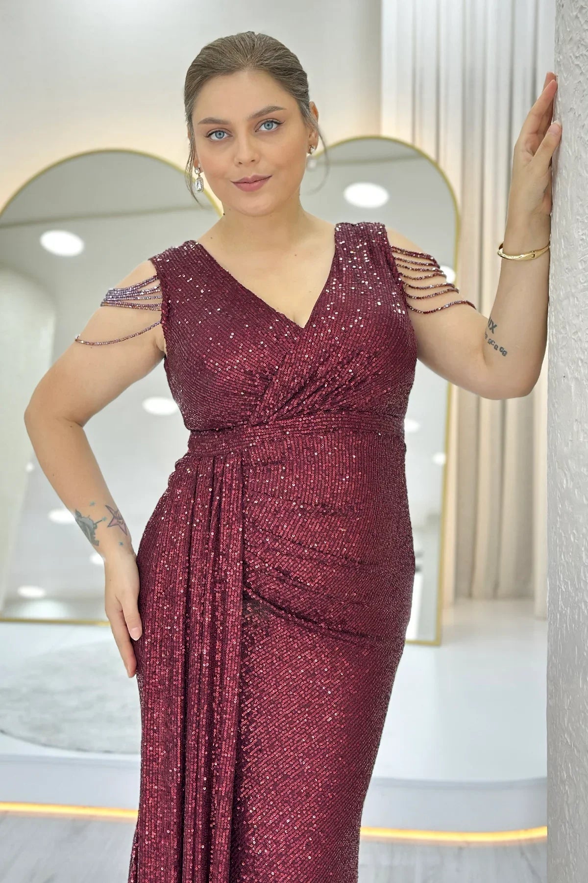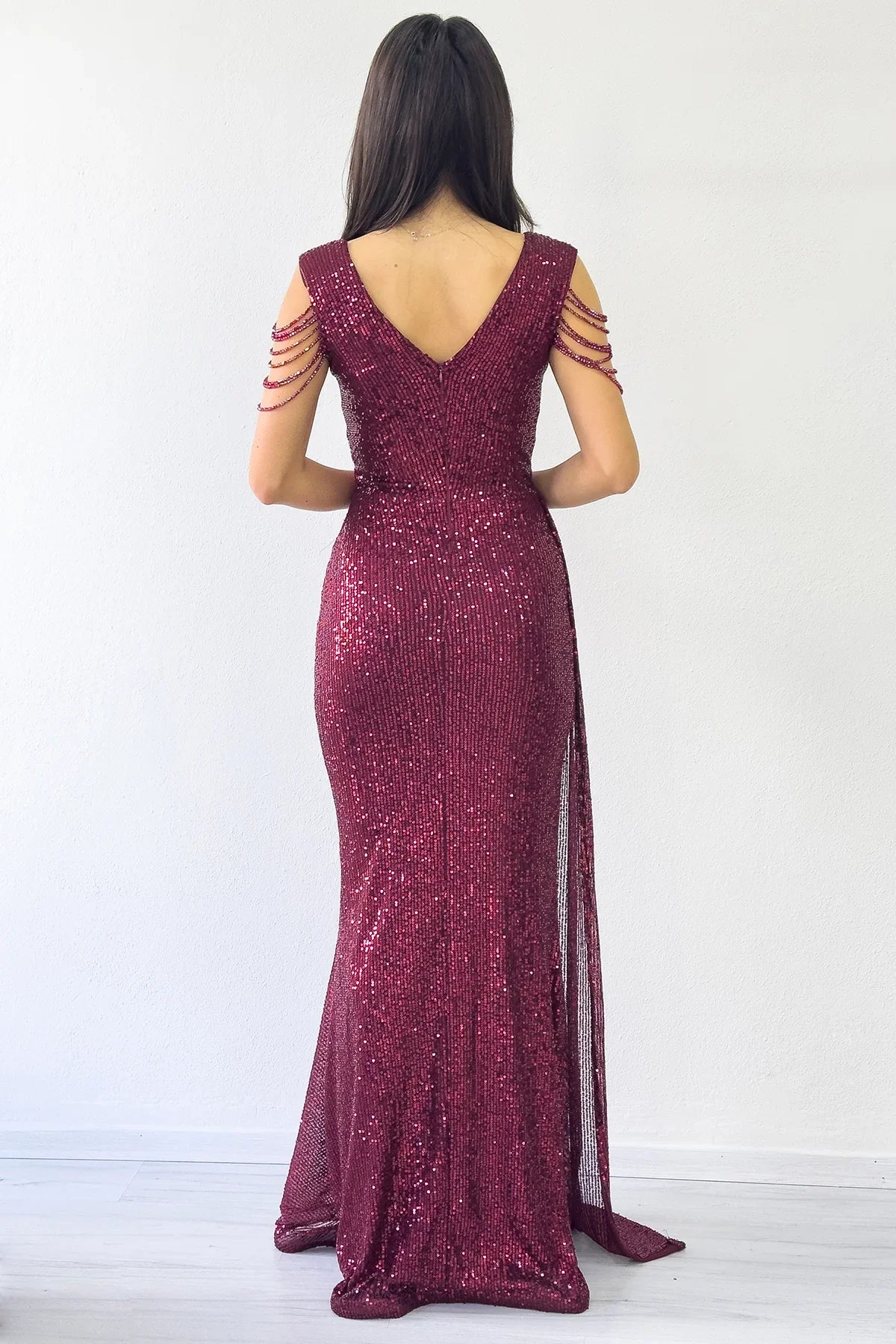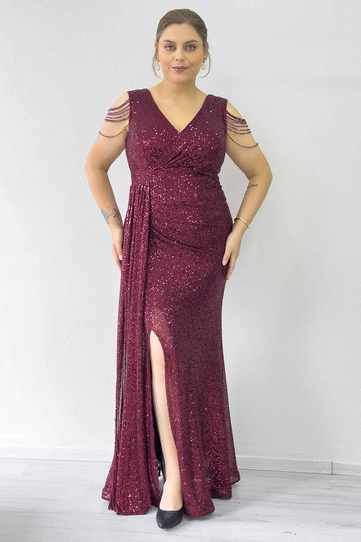 Bordo Kruvaze Yaka Omuz Detay Pul Payet Büyük Beden Abiye Elbise