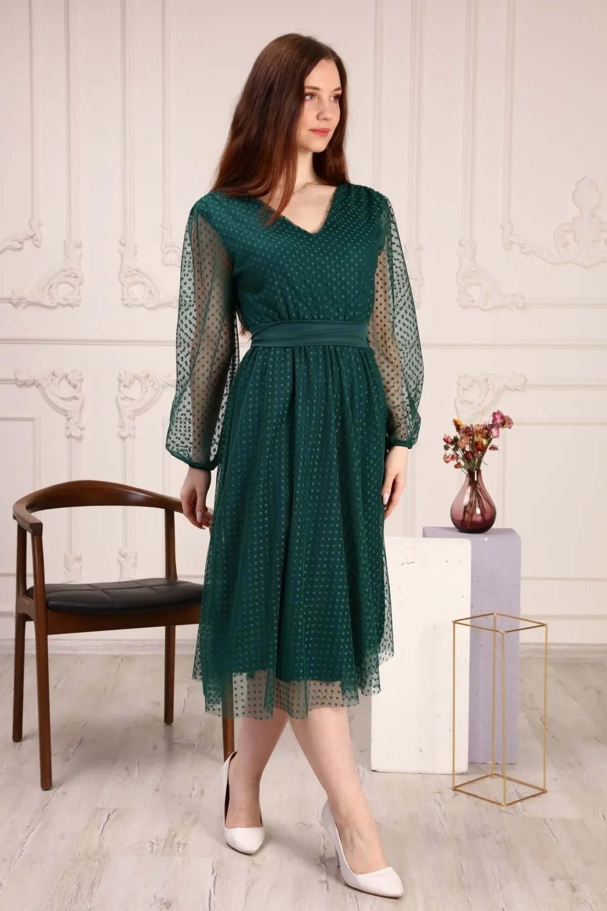 Zümrüt Yeşili Puantiyeli Kuşaklı Tütü Büyük Beden Elbise