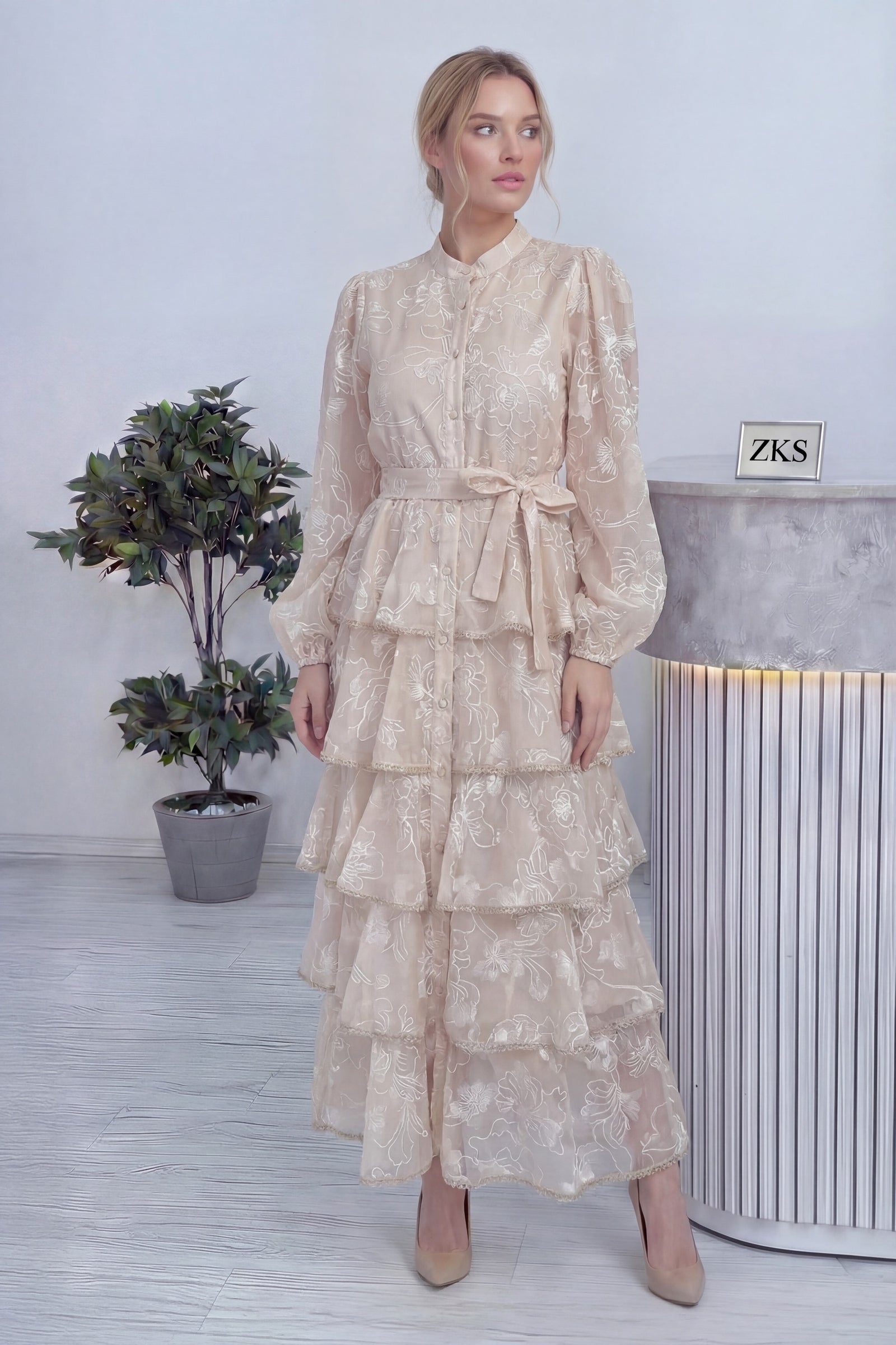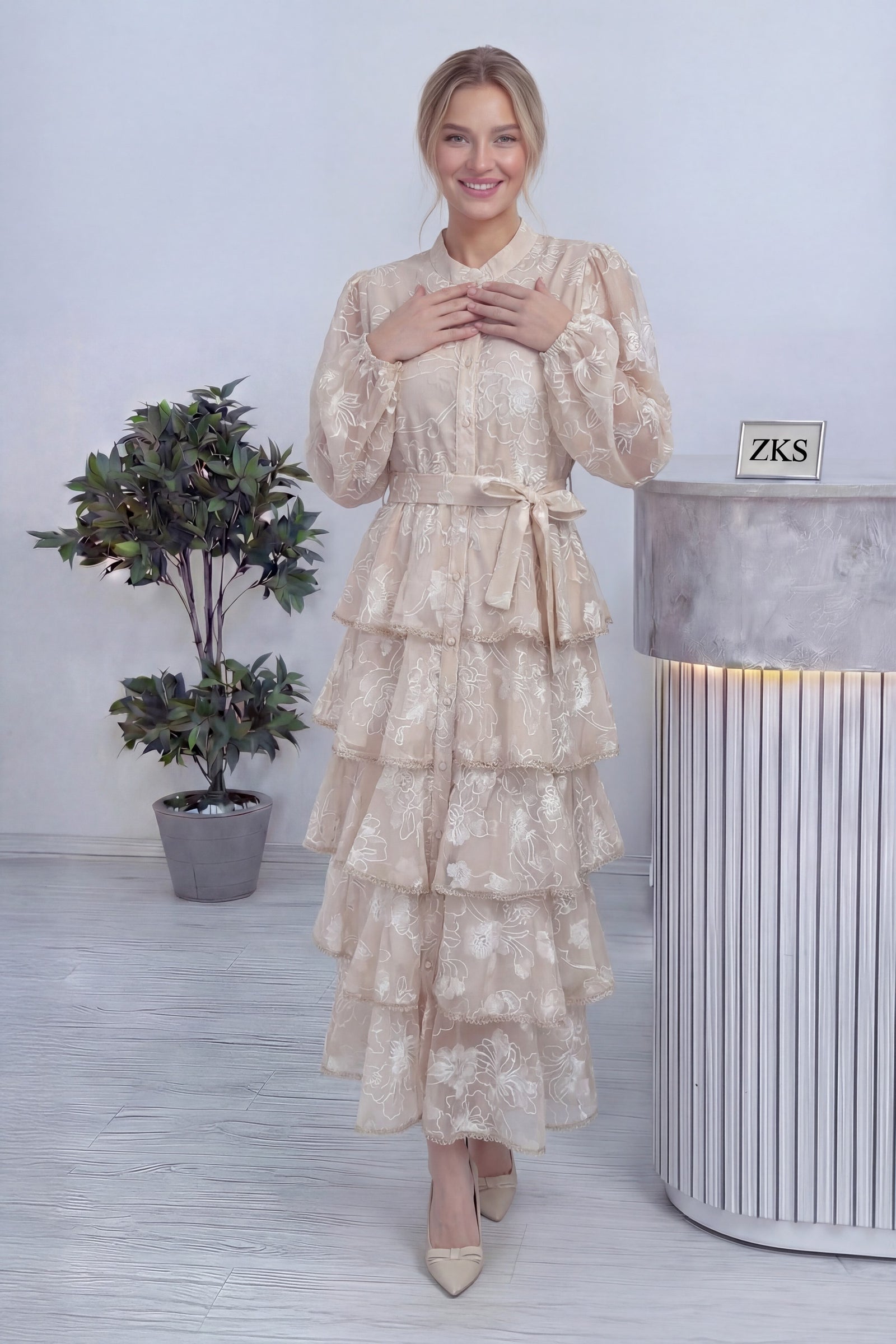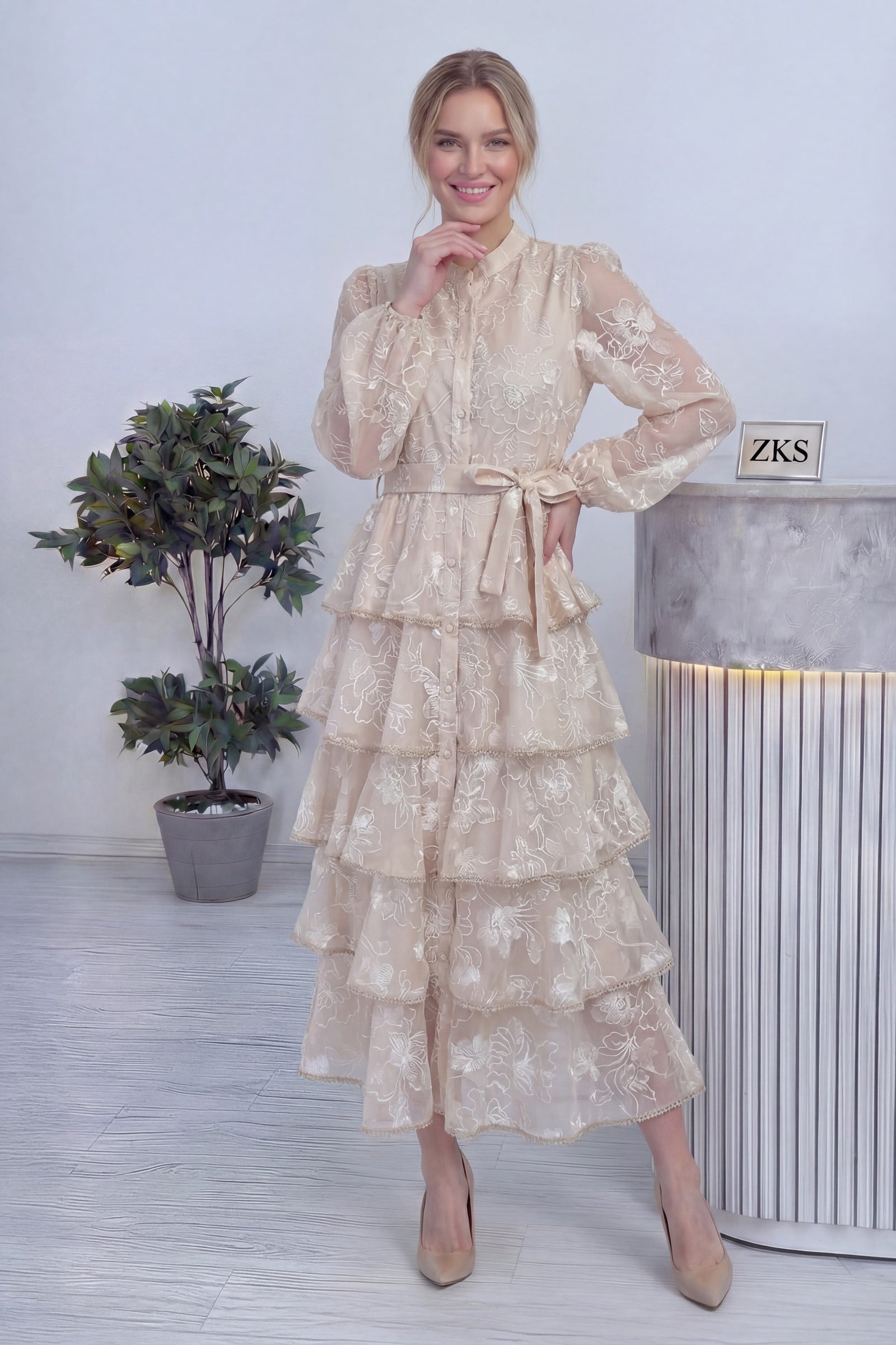 Ekru Çiçek Desenli Kat Kat Volanlı Kuşaklı Elbise