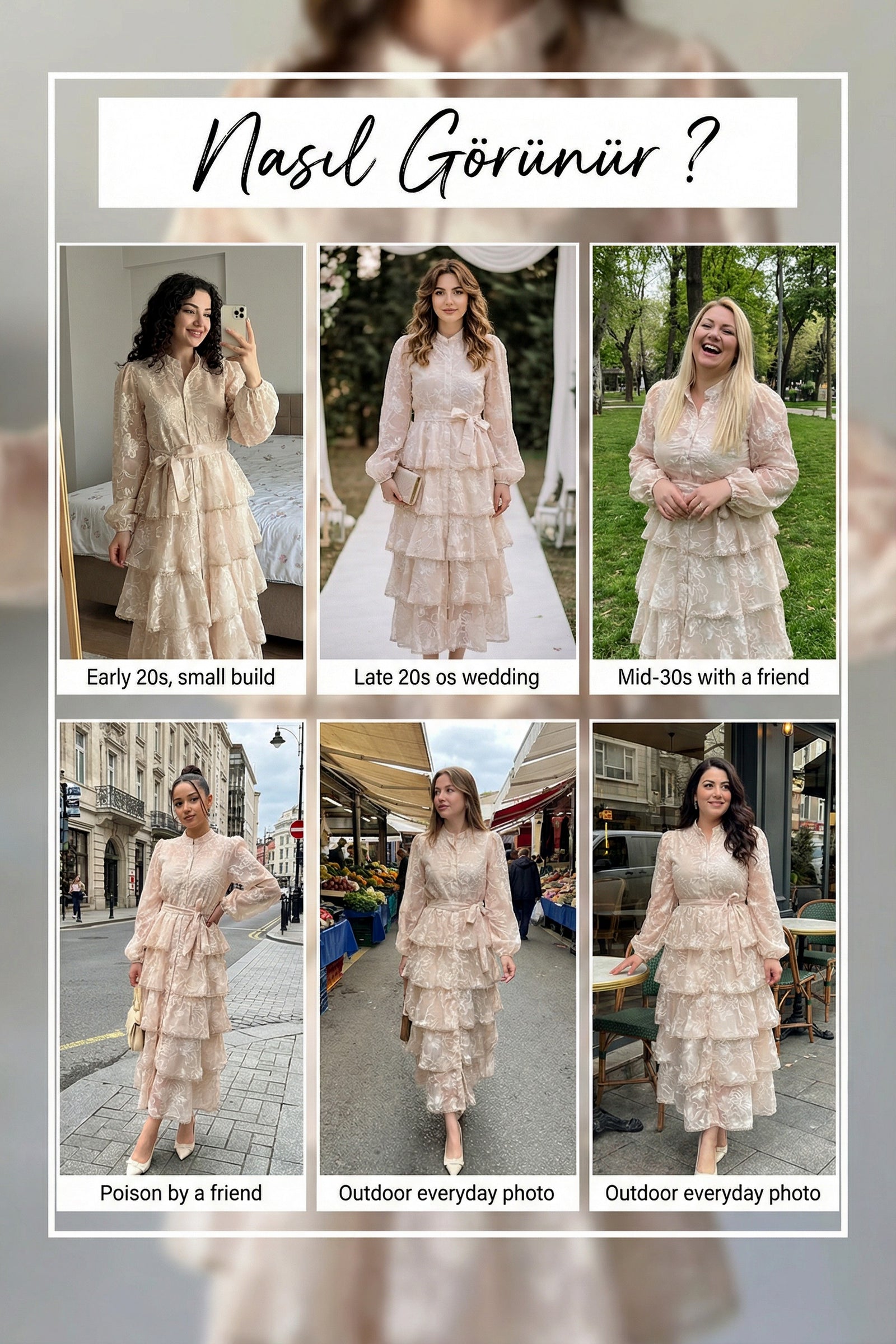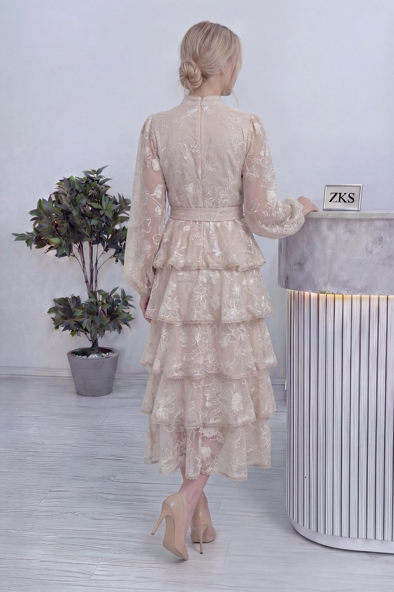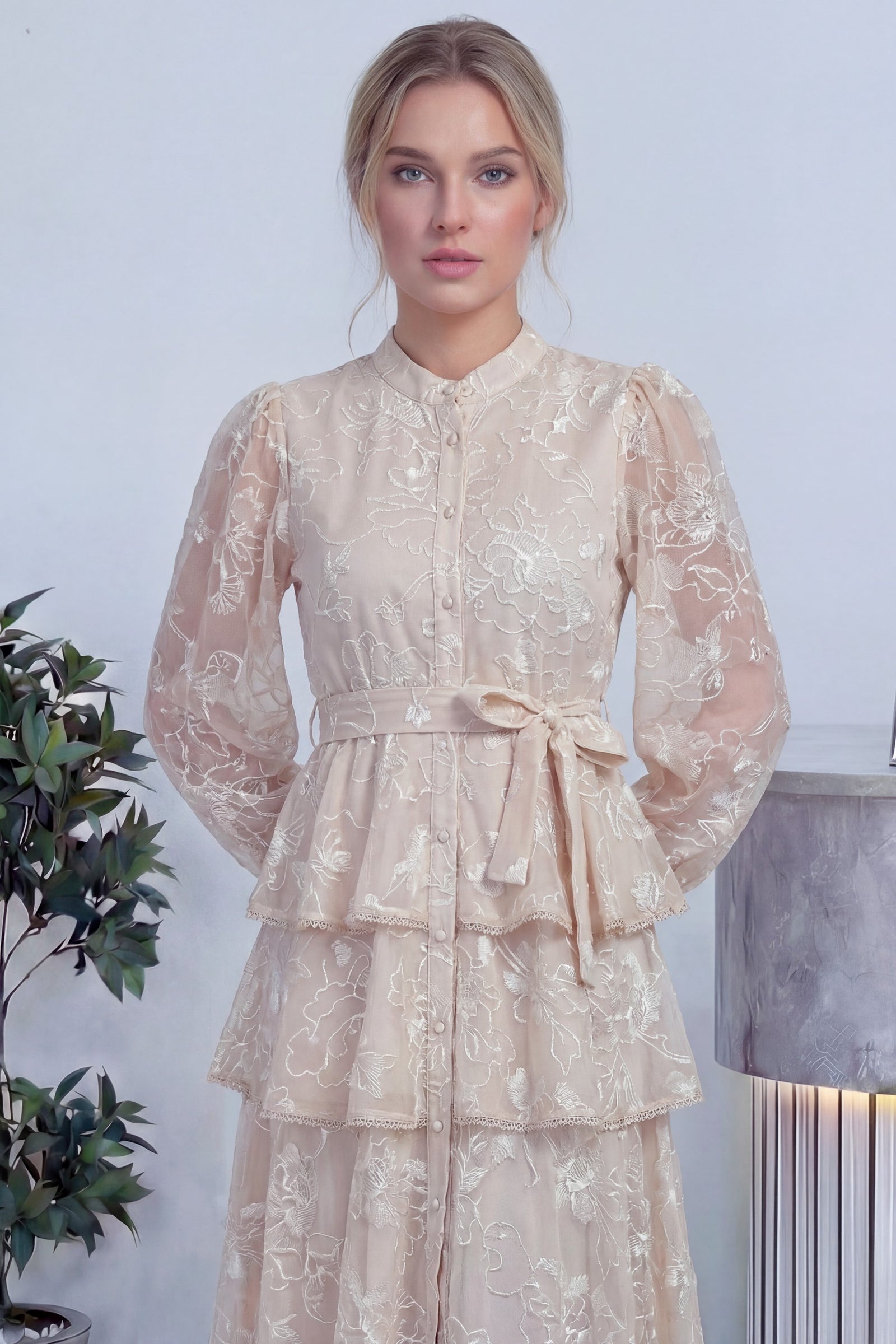 Ekru Çiçek Desenli Kat Kat Volanlı Kuşaklı Elbise