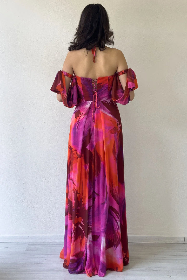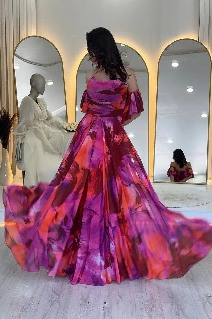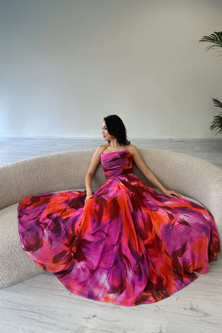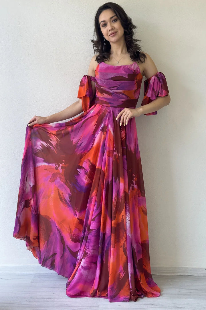 Fuşya Desenli Askılı Straplez Göğüs Drapeli Çıkarılabilir Kol Detaylı Abiye Elbise