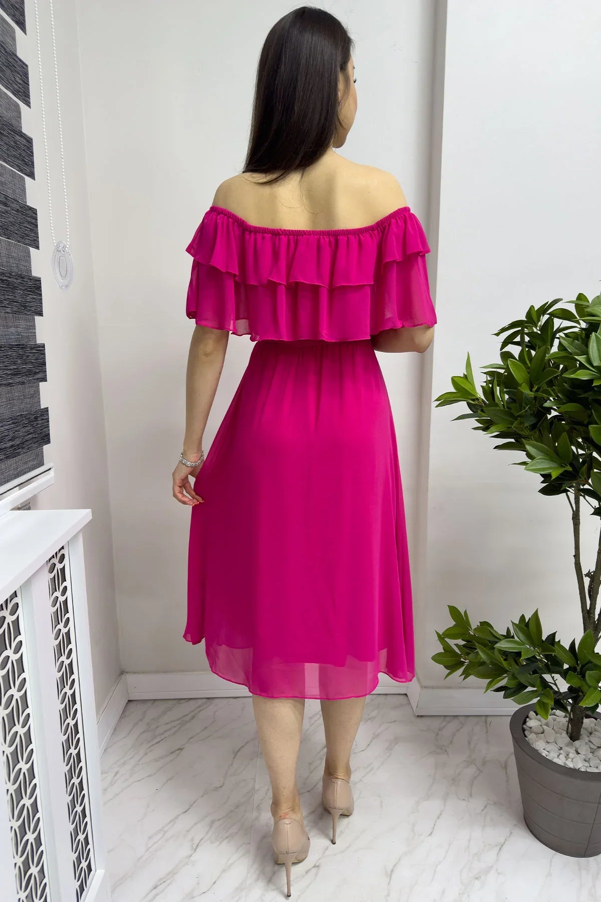 Fuşya Madonna Carmen Fırfır Yaka Büyük Beden Şifon Elbise