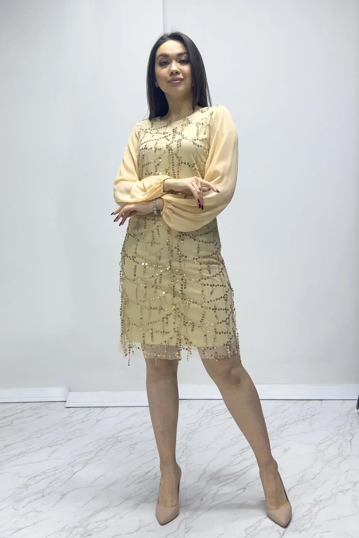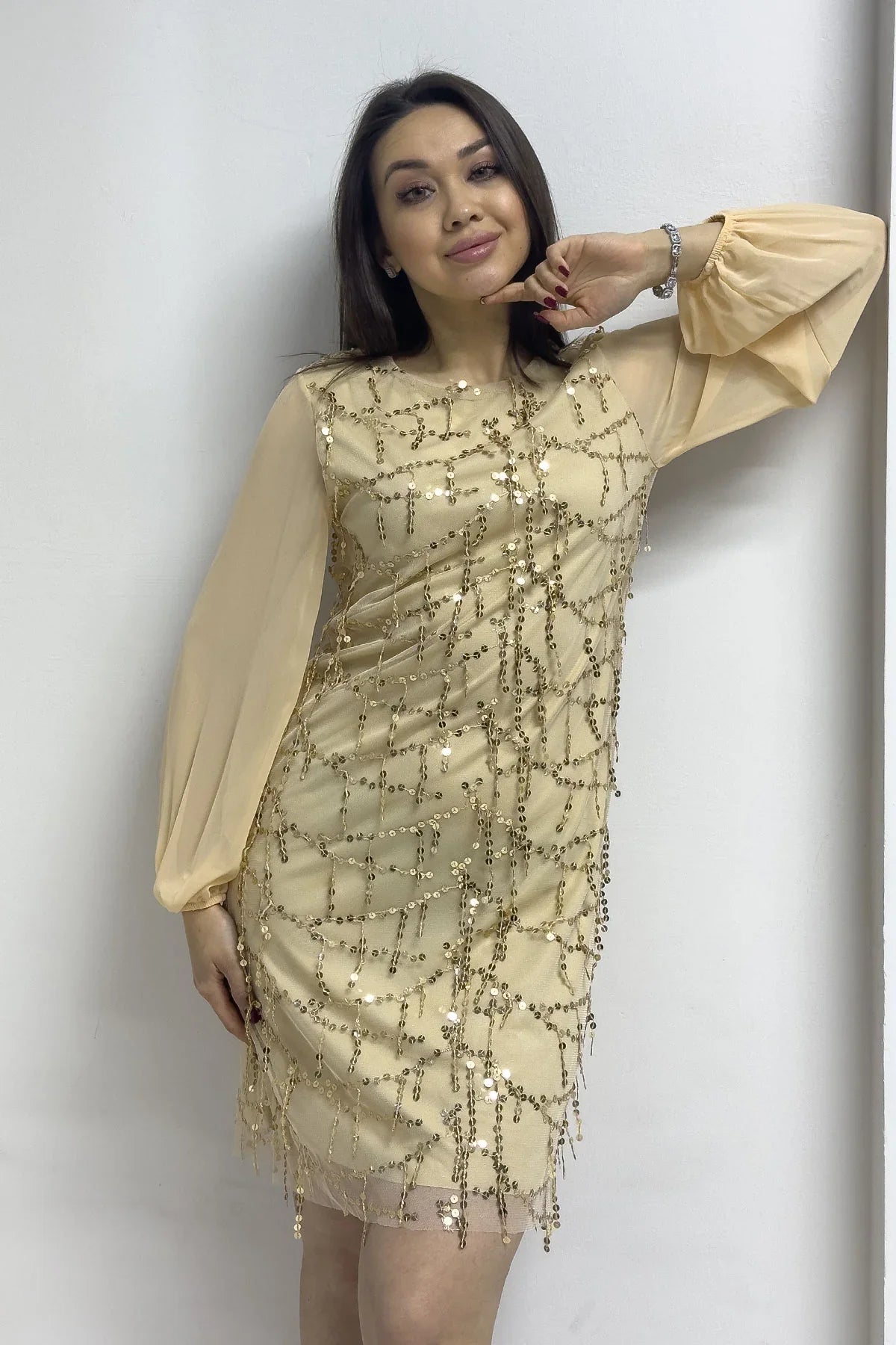 Gold Kadın Büyük Beden Şifon Pulpayet Abiye Elbise