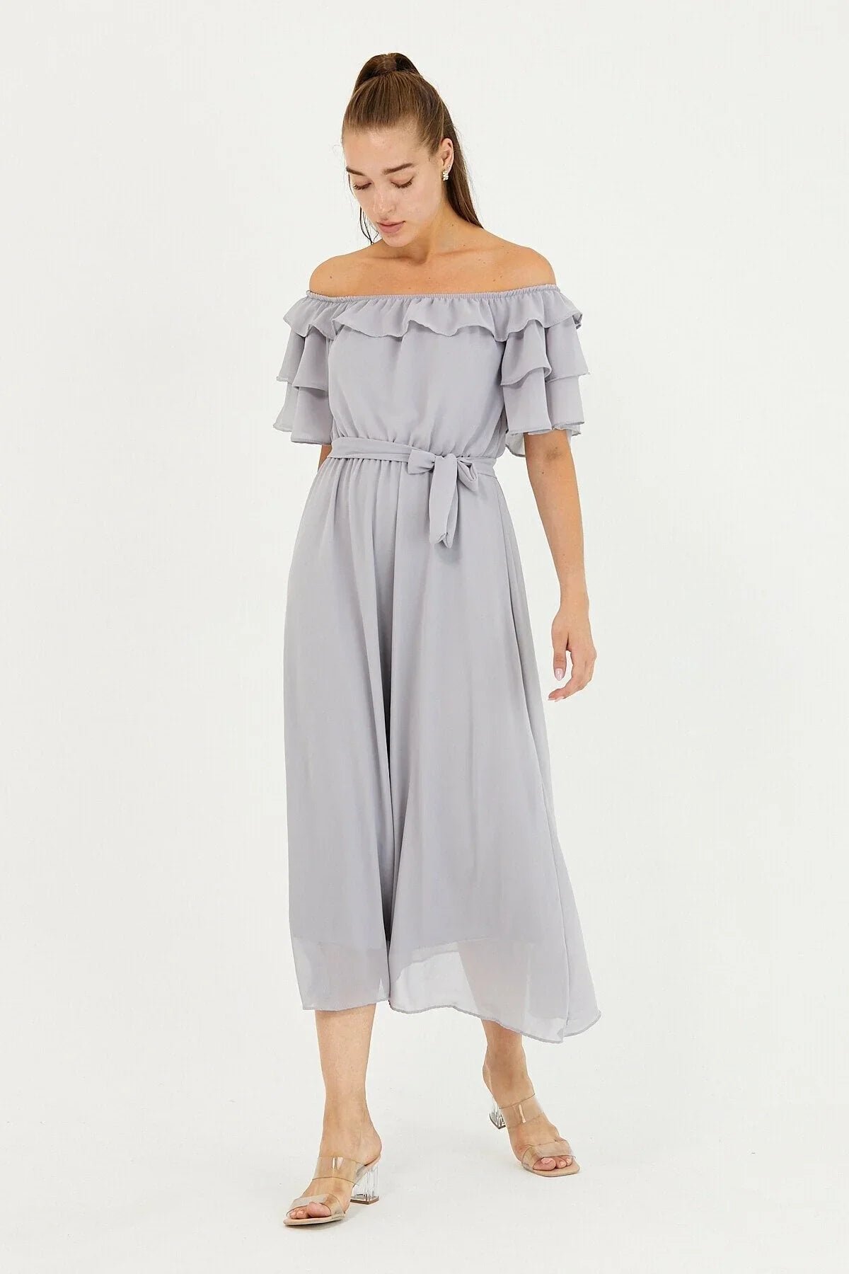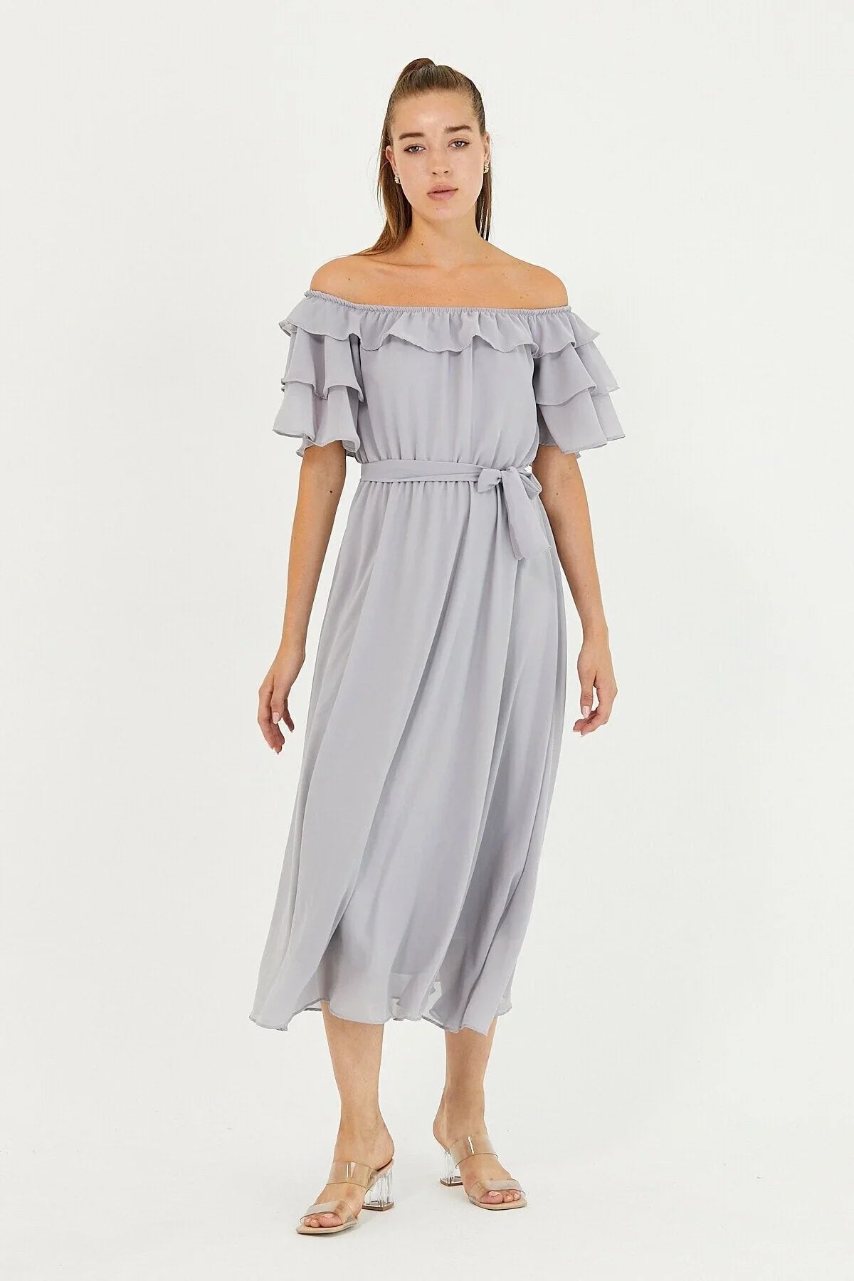 Gri Volanlı Madonna Yaka Büyük Beden Şifon Elbise
