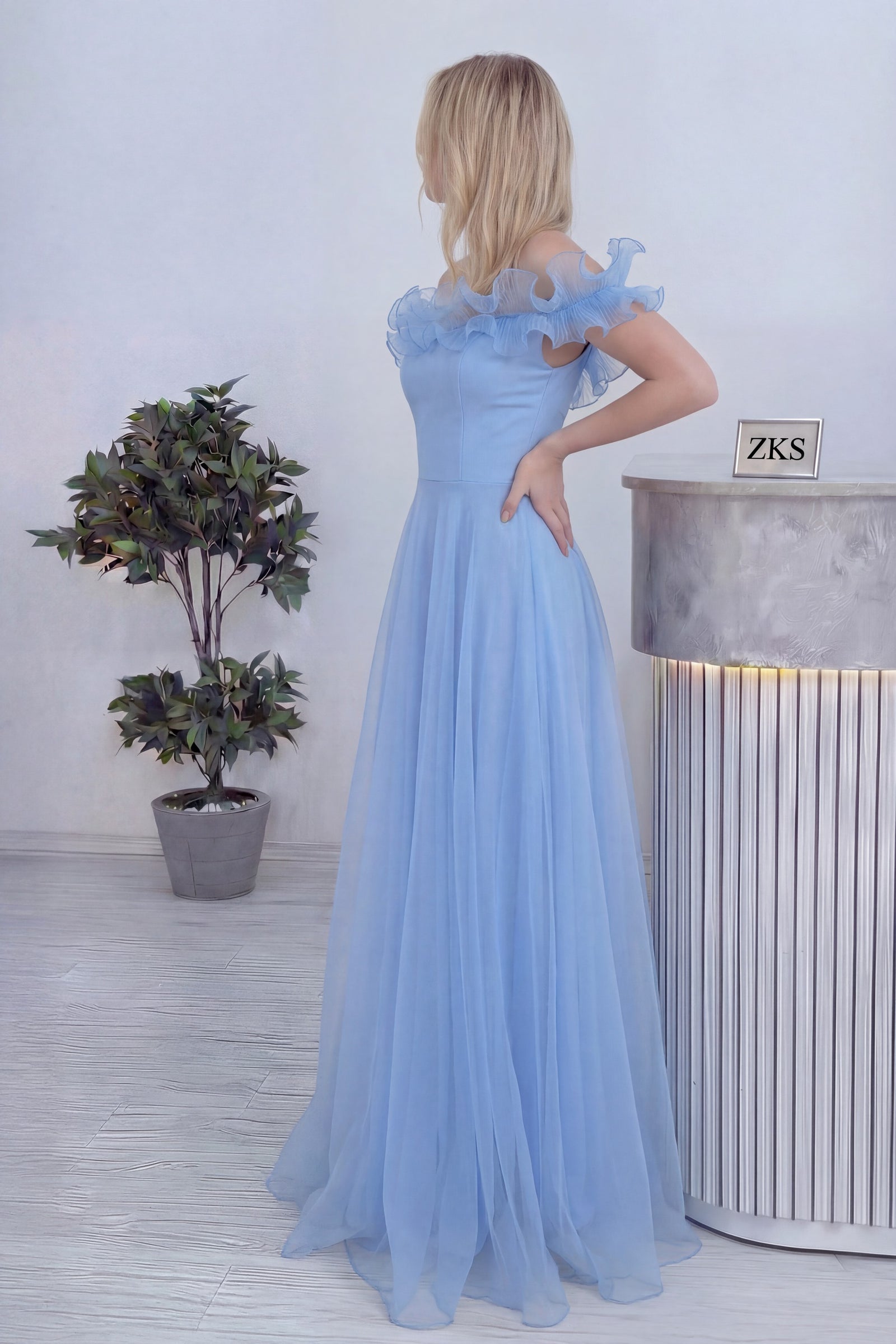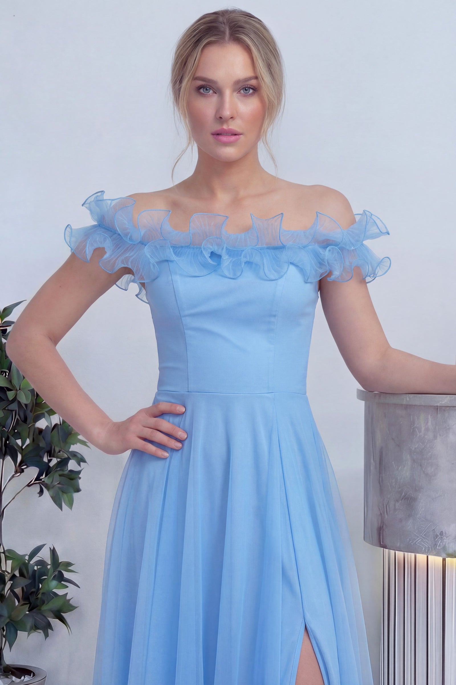 Kadın Bebe Mavi Volanlı Düşük Omuz Abiye Elbise