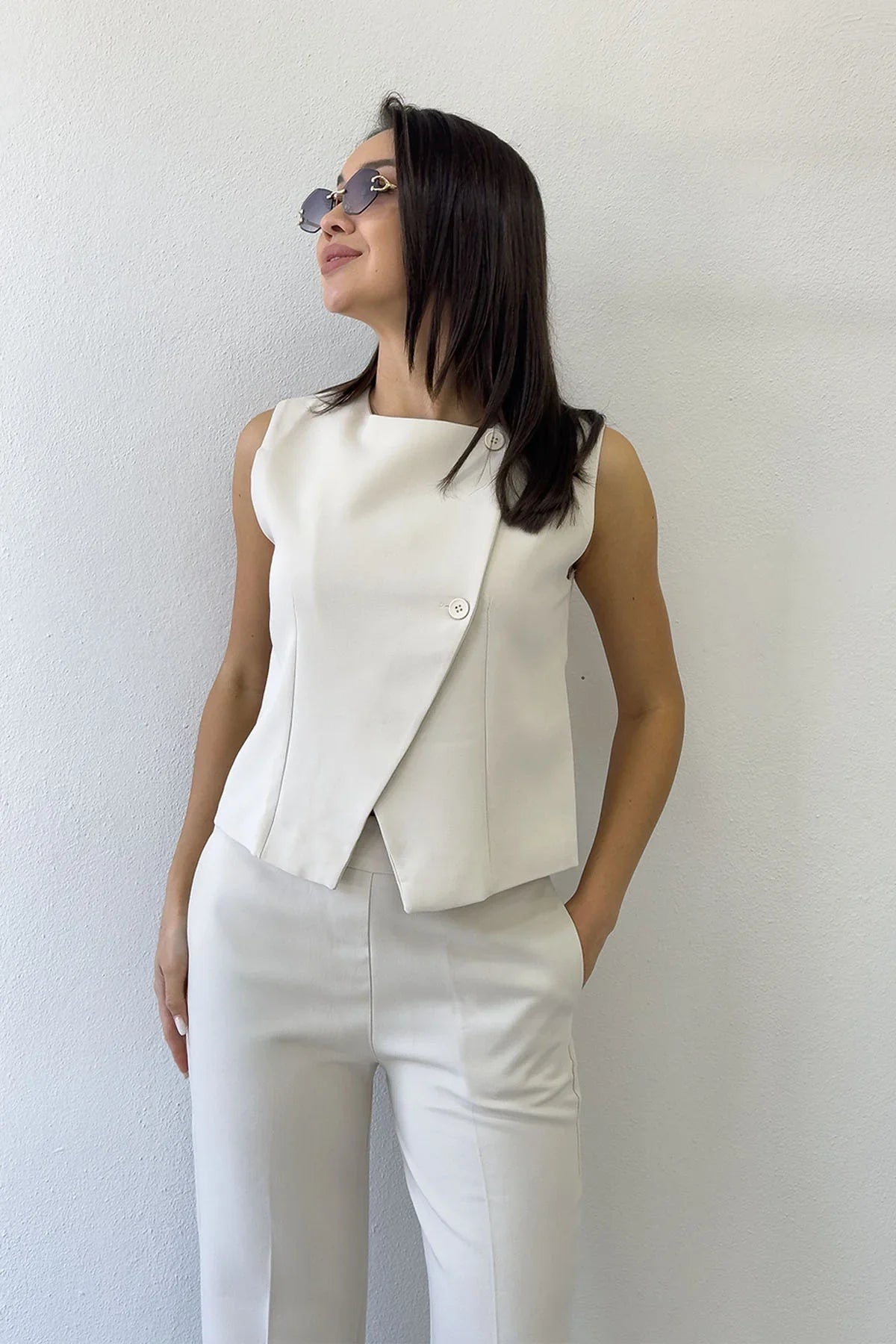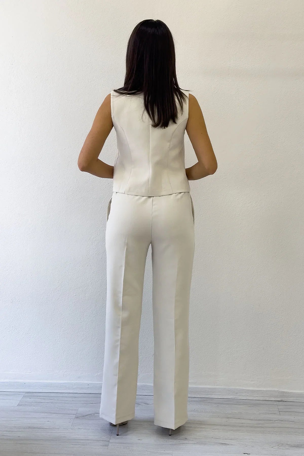 Kadın Bej Çapraz Düğmeli Yelek Pantolon İkili Takım