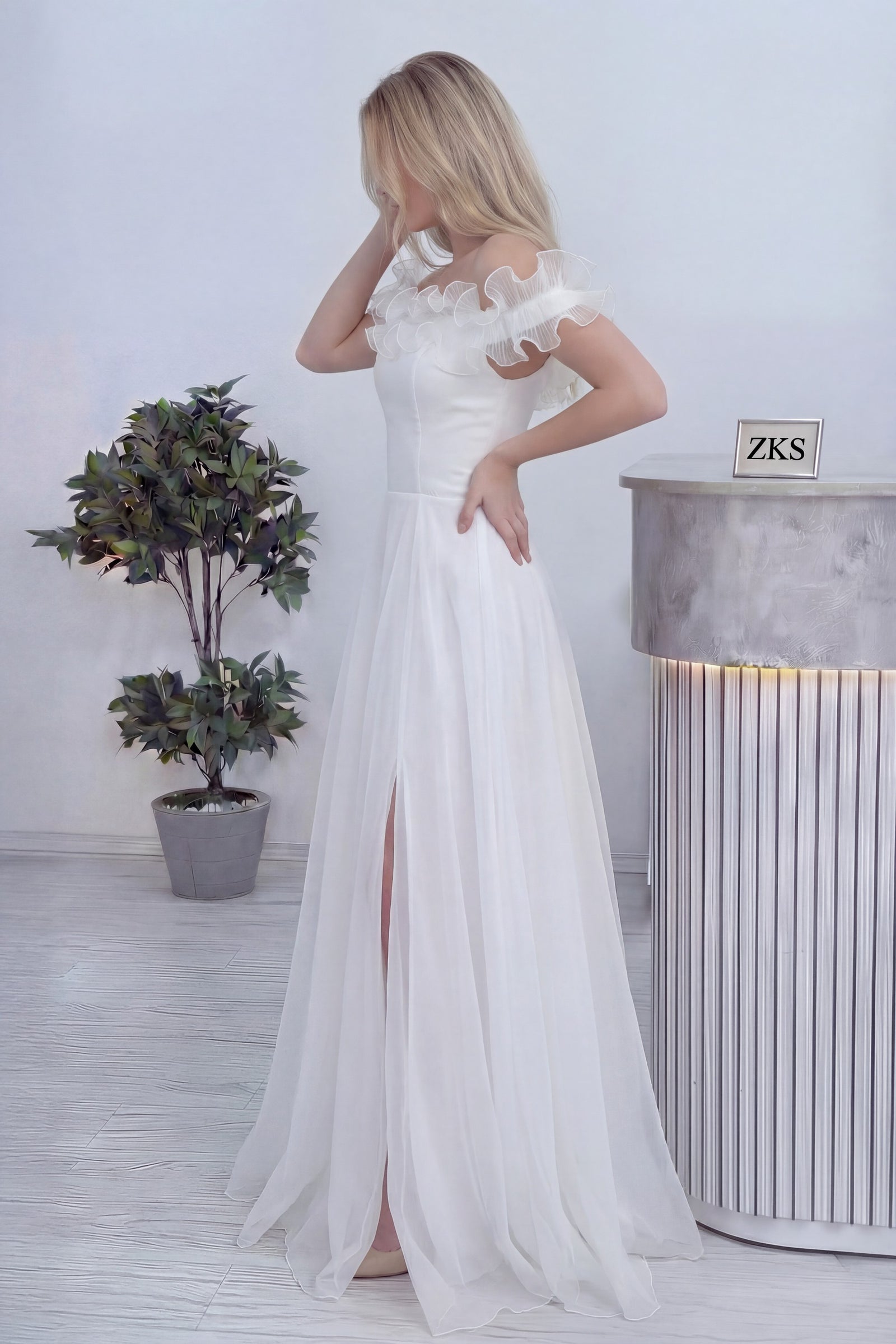 Kadın Beyaz Volanlı Düşük Omuz Nikah Abiye Elbise