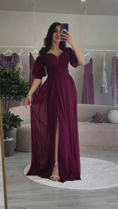 Kadın Bordo Kısa Kol Drapeli Abiye Elbise