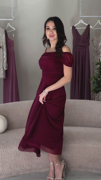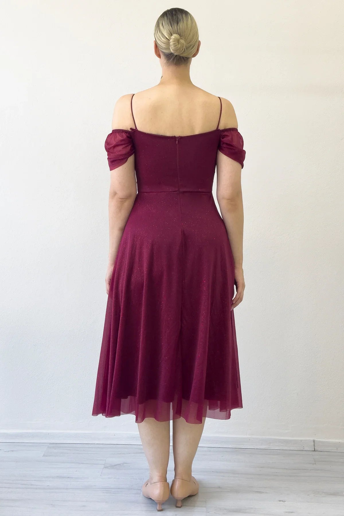Kadın Bordo Midi Boy Kloş Askılı Düşük Omuz Abiye Elbise