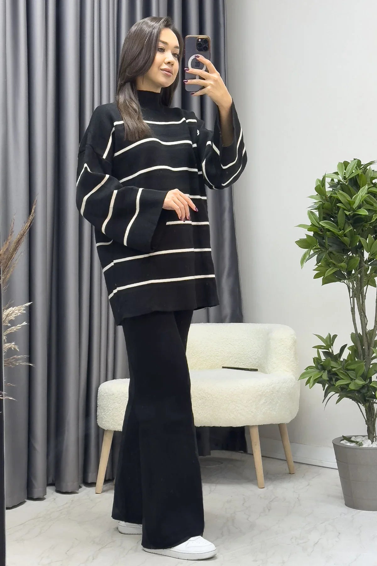 Kadın Çizgili Siyah Triko Pantolon Kazak İkili Takım