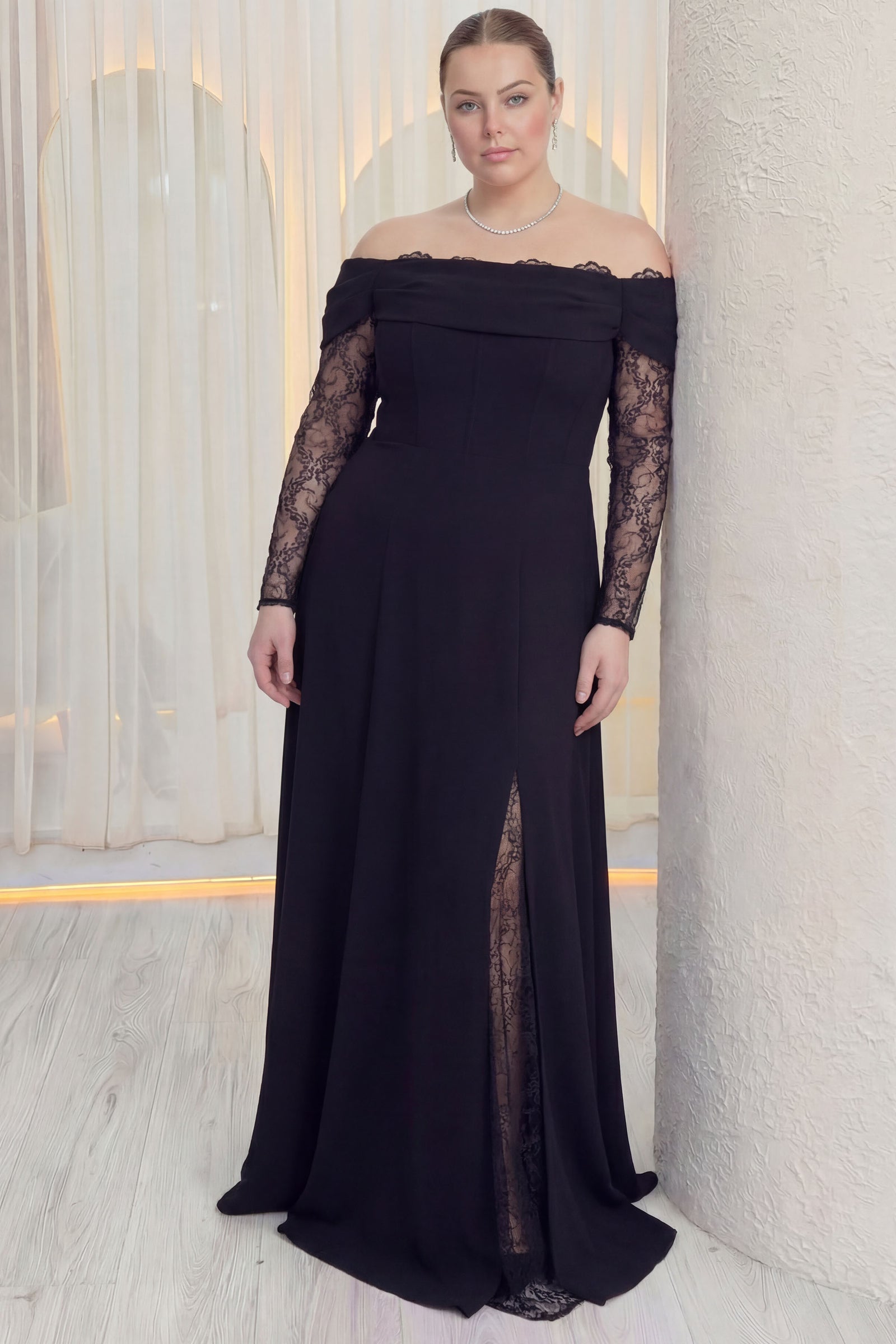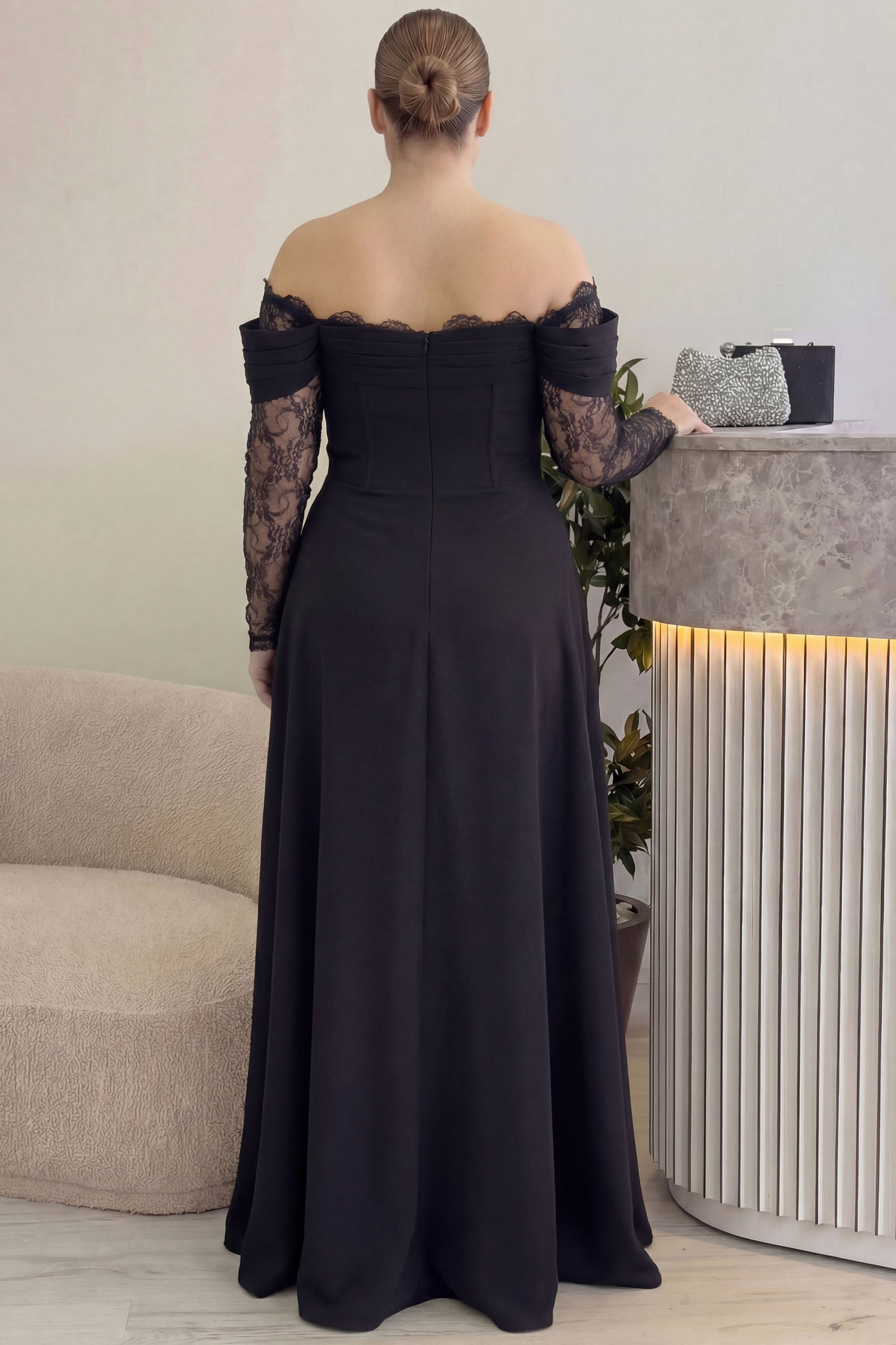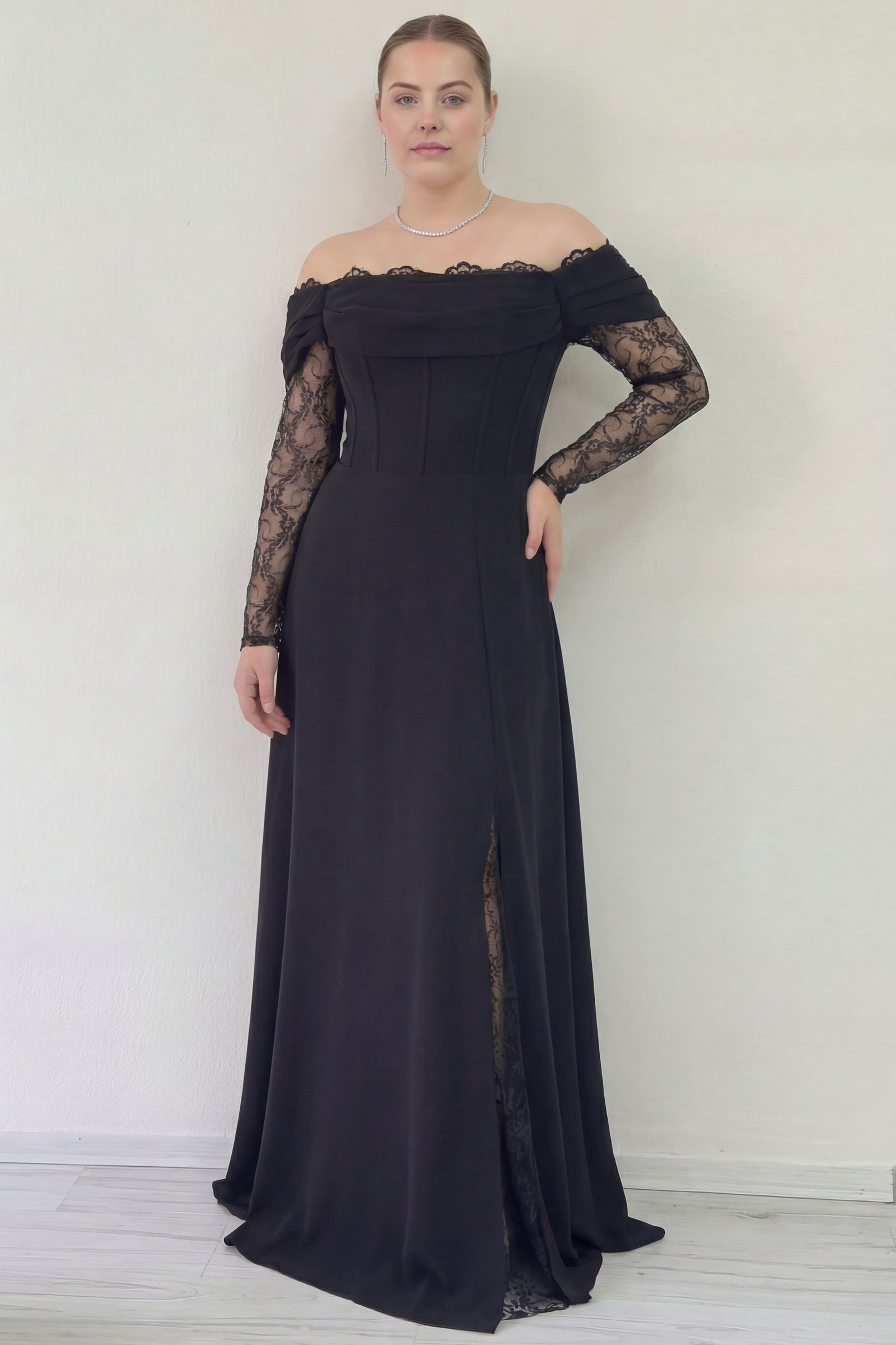 Kadın Düşük Omuz Dantel Detaylı Siyah Büyük Beden Abiye Elbise