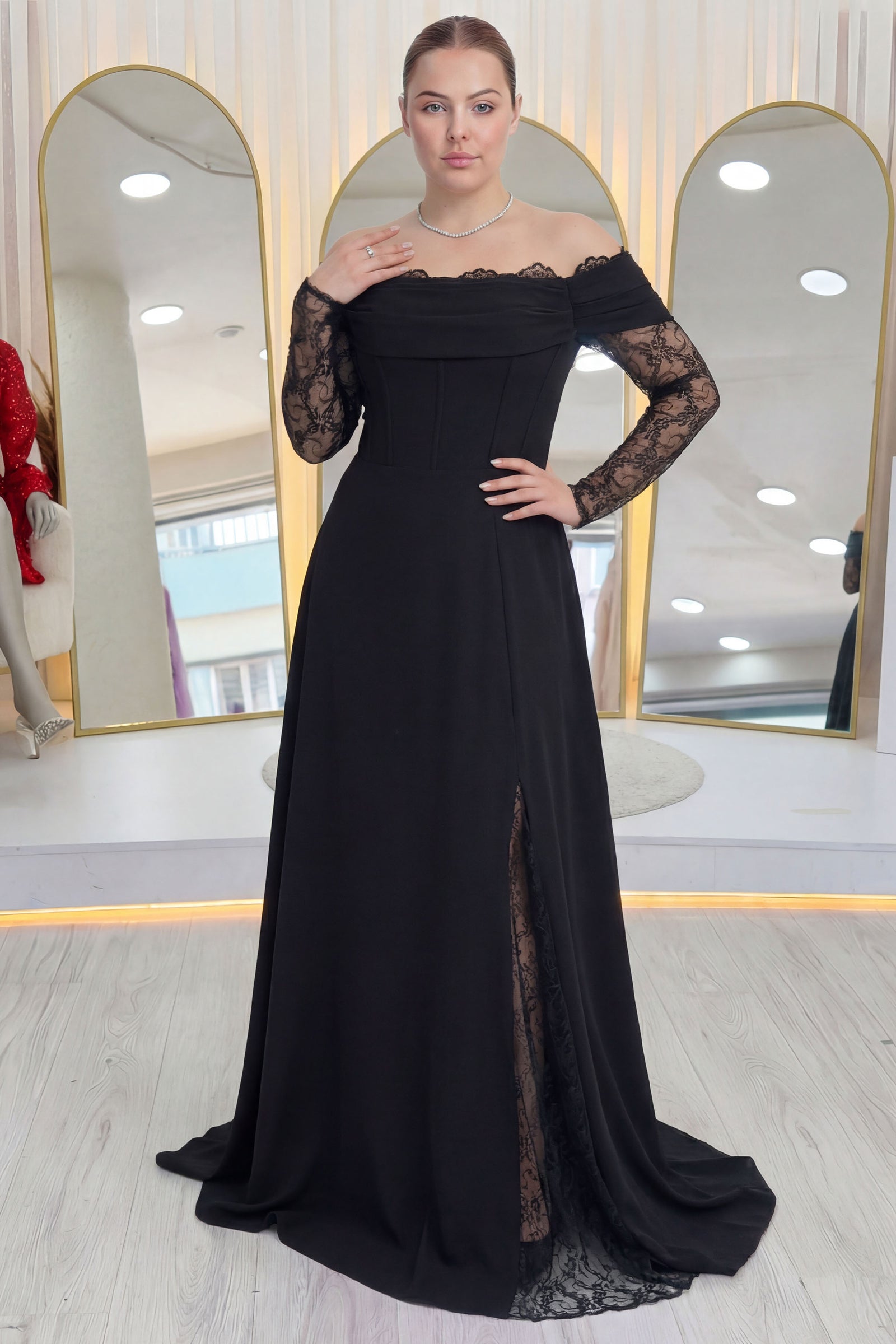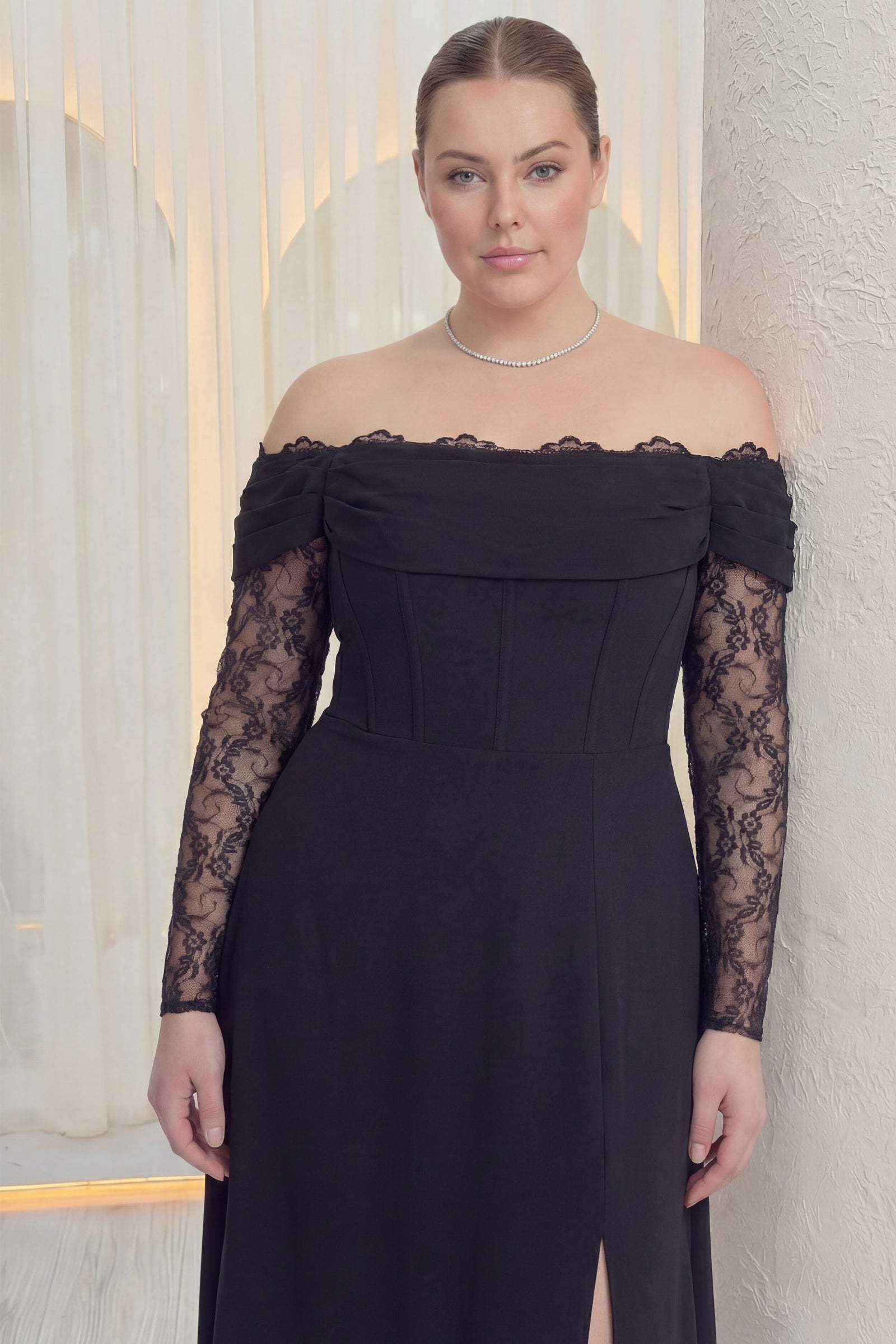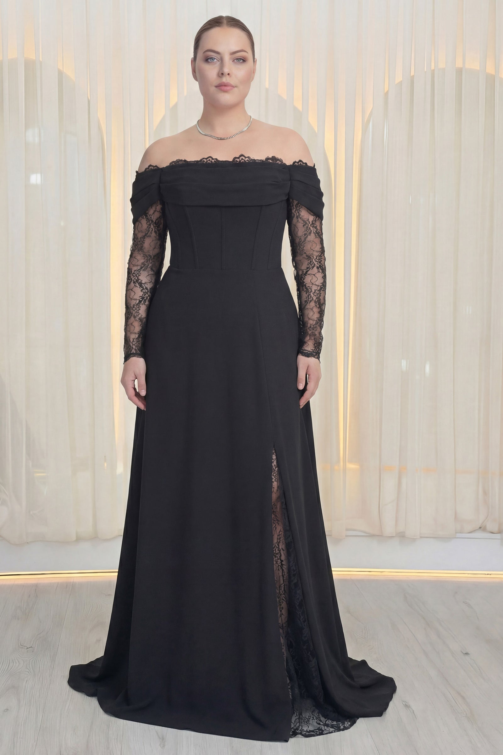 Kadın Düşük Omuz Dantel Detaylı Siyah Büyük Beden Abiye Elbise