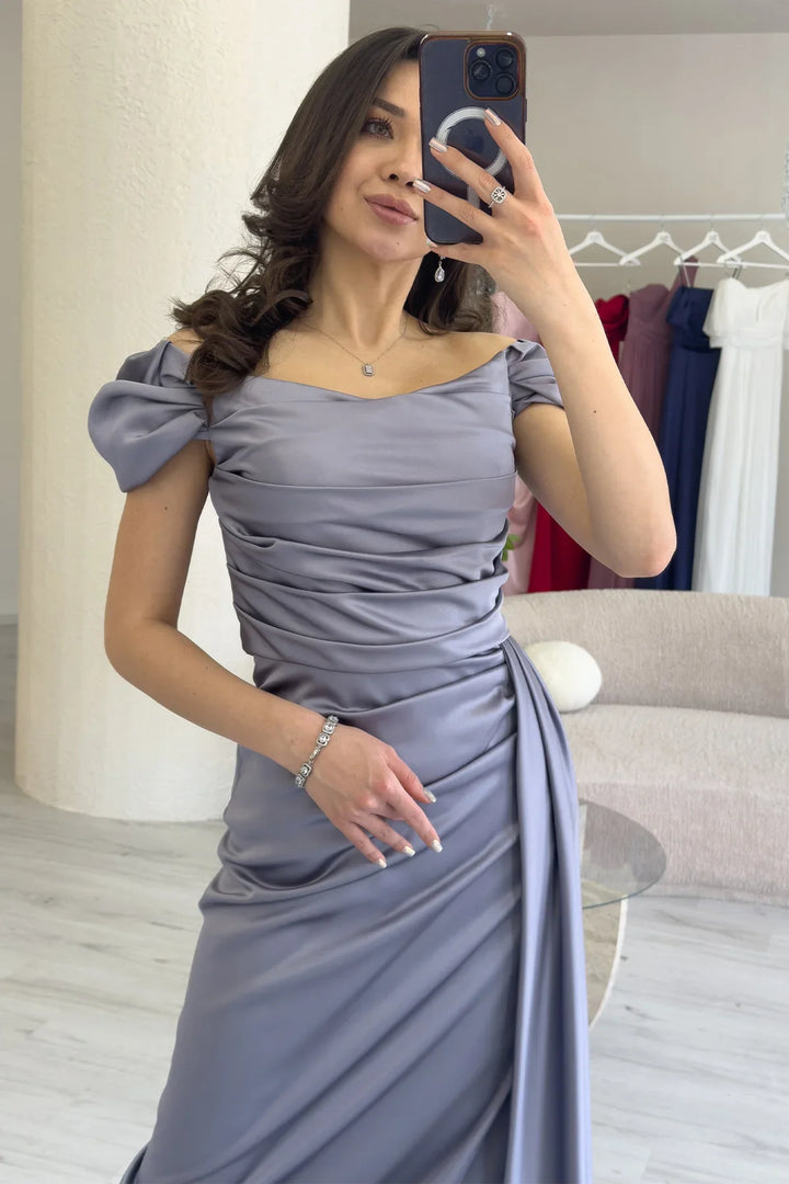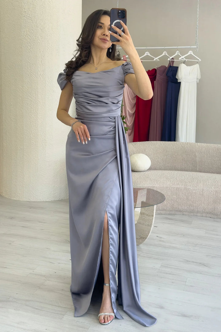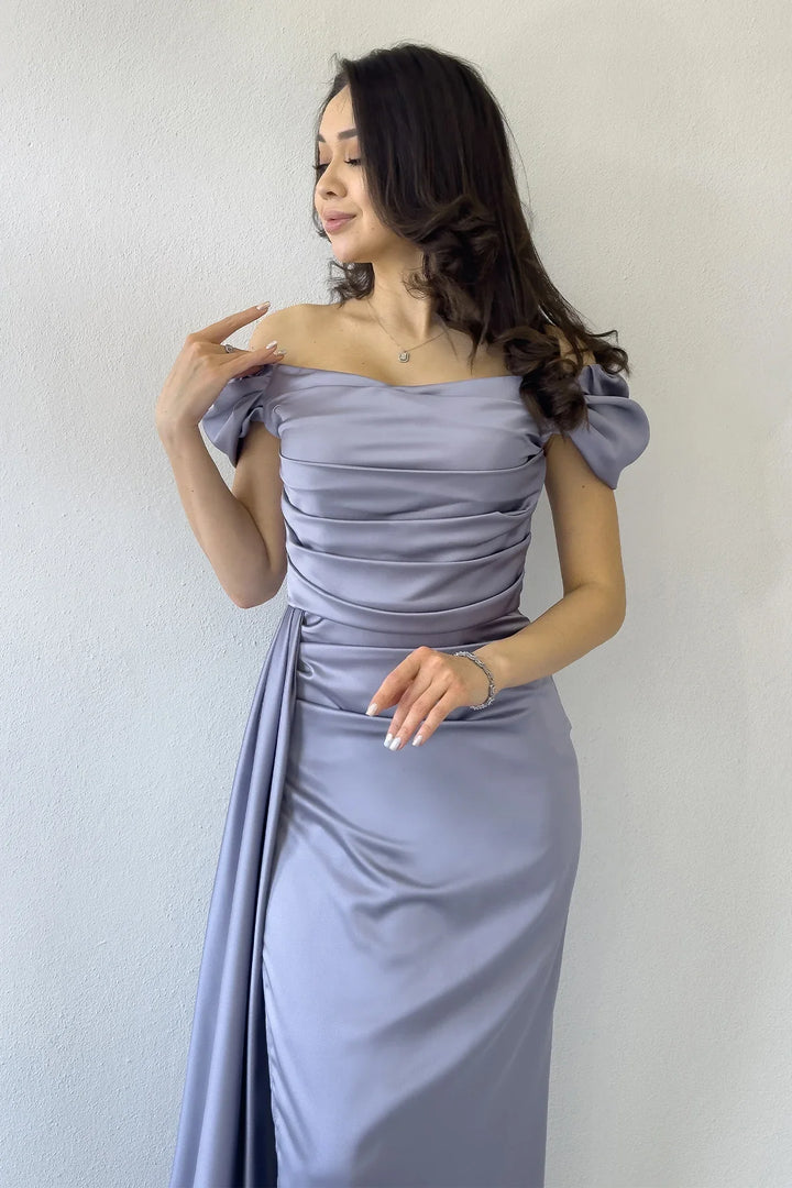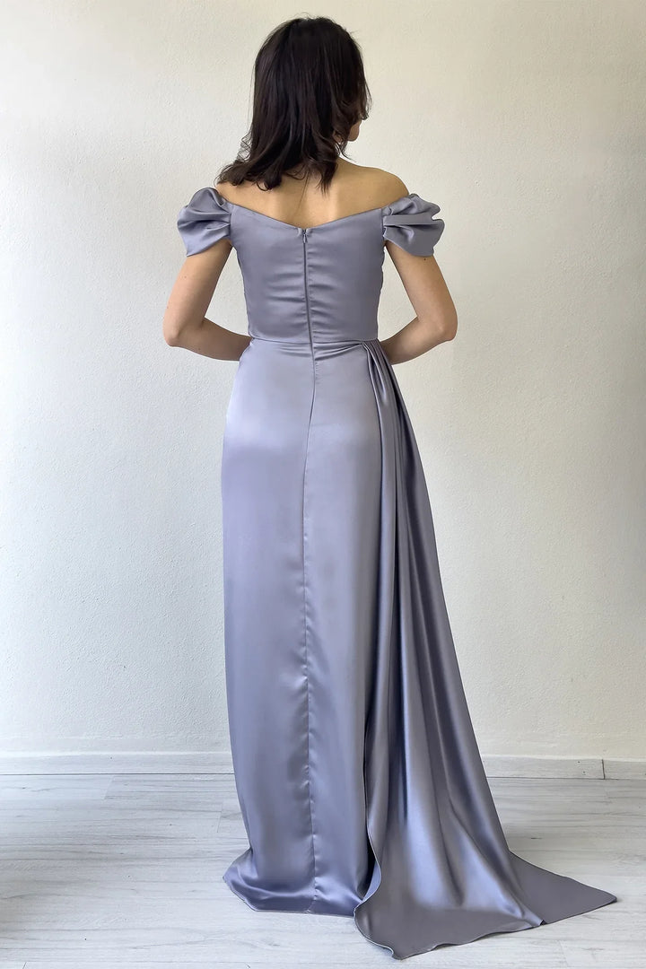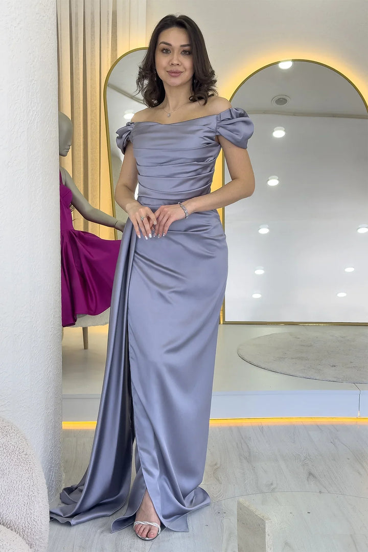 Kadın Gümüş Düşük Omuz Saten Drapeli Yırtmaçlı Abiye Elbise