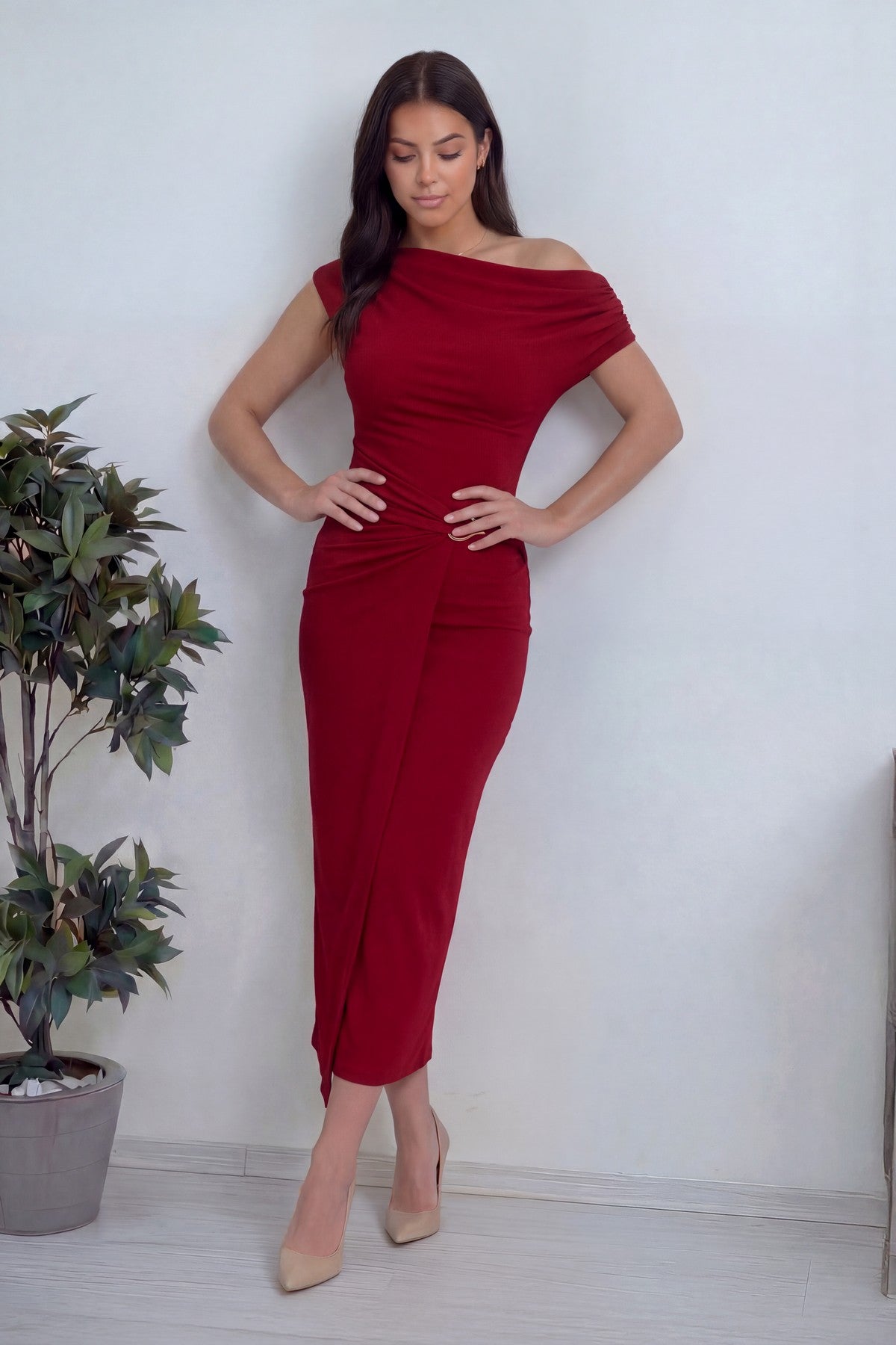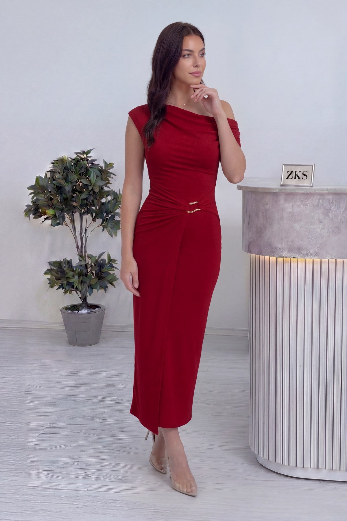 Düşük omuz elbise arayanlar için feminen şıklık bu modelde güçlü bir duruşla sunuluyor. Kırmızı rengin enerjisini taşıyan bu tasarımın en dikkat çekici özelliği, omuzları açıkta bırakan düşük omuz kesimi ve bel kısmında yer alan aksesuar detayı. Bu iki detay birlikte hem daha zarif hem de daha dengeli bir siluet oluşturur. Özellikle kırmızının dikkat çekici tonu ile birleştiğinde, bulunduğun ortamda fark edilmeni sağlayan güçlü bir görünüm ortaya çıkar. Düşük omuz formu üst bedeni daha geniş ve dengeli gösterirken beldeki aksesuar detayı odak noktasını merkeze çekerek vücudu daha orantılı gösterir. Midi boy kesim ise elbiseye hem klasik hem modern bir karakter kazandırır. Bu sayede hem davetlerde hem özel organizasyonlarda rahatlıkla tercih edilebilecek çok yönlü bir parça haline gelir. The ZKS 2026 koleksiyonunda yer alan bu model XS’den XL’e kadar beden aralığında sunulmaktadır. Kumaş yapısı akışkan ve konforludur. Vücuda yapışmadan formunu korur, gün boyu kullanımda rahatsızlık hissi oluşturmaz. Özellikle uzun süreli davetlerde hem şık hem rahat hissetmek isteyenler için ideal bir seçenek sunar. Bu elbise kimler için idealdir? Davetlerde dikkat çekmek isteyen, feminen ve iddialı bir stil arayan, elbise ile güçlü bir görünüm elde etmek isteyen kadınlar için tasarlandı. Nasıl Kombin Yapılır? Altın tonlu topuklu ayakkabılar ile kırmızının enerjisini destekleyebilirsin. Minimal aksesuarlar ile görünümü dengeleyerek elbisenin ön plana çıkmasını sağlayabilirsin.