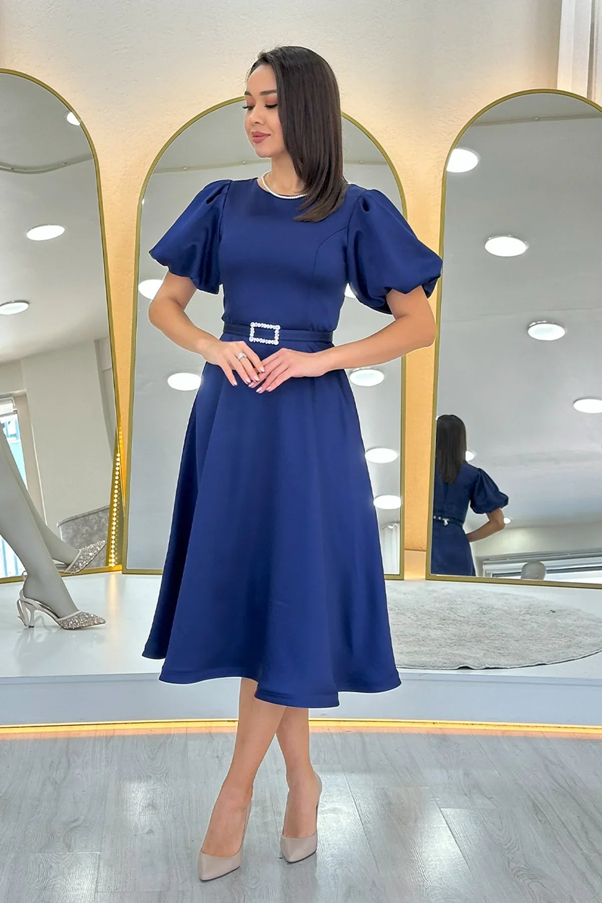 Kadın Lacivert Balon Kol Taş Kemerli Midi Boy Saten Abiye Elbise