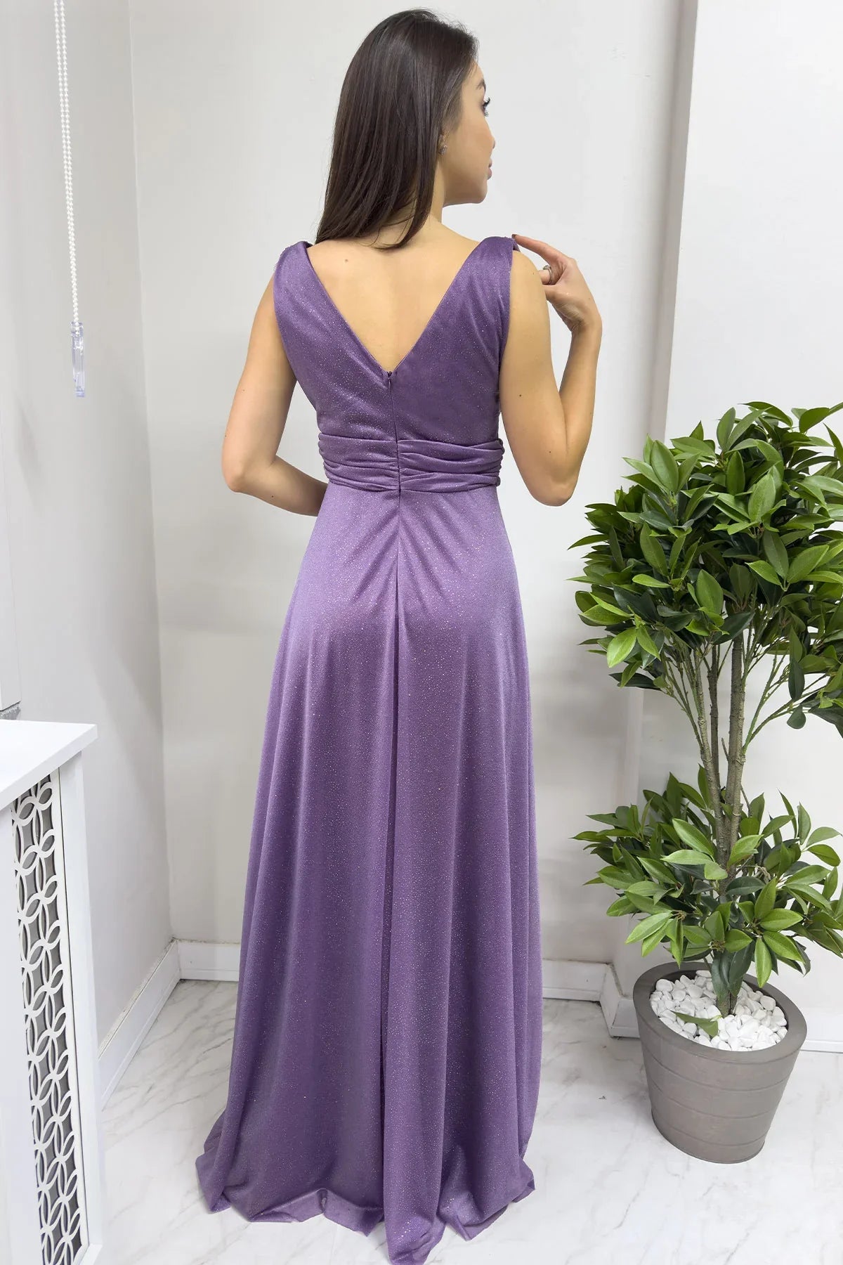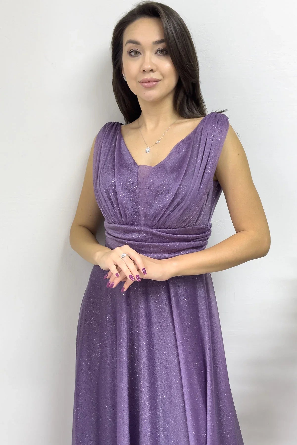 Kadın Koyu Lila Sıfır Kol Transparan Detay Abiye Elbise