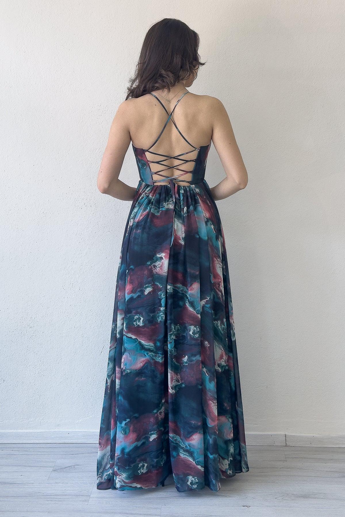 Kadın Petrol Yeşil Batik Desenli Straplez Askılı Sırt Dekolteli Yırtmaçlı Abiye Elbise