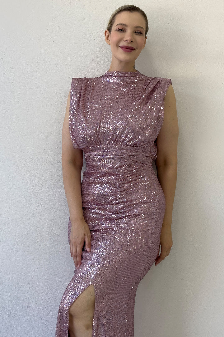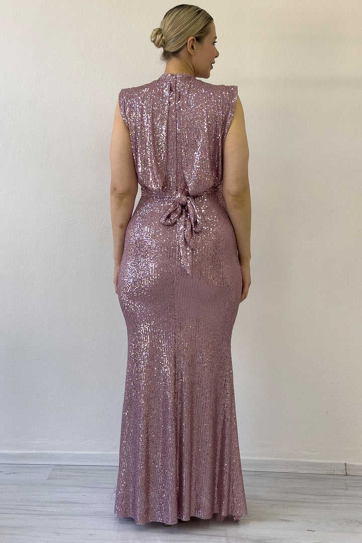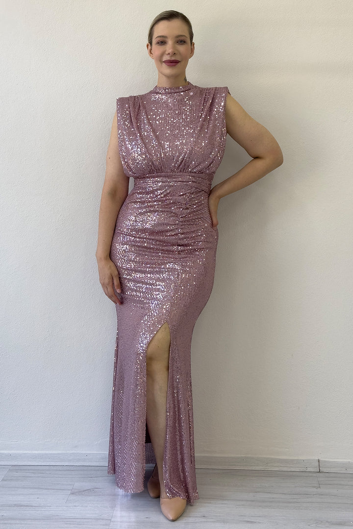 Kadın Pudra Dik Yaka Kuşak Detay Yırtmaçlı Pul Payet Abiye Elbise