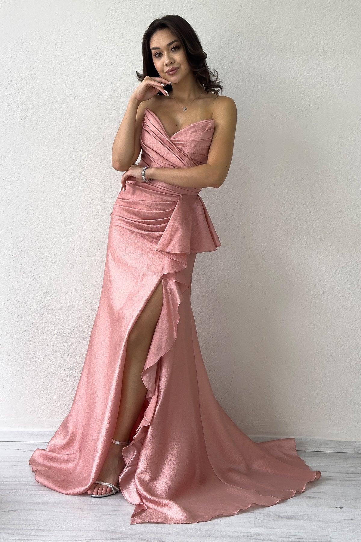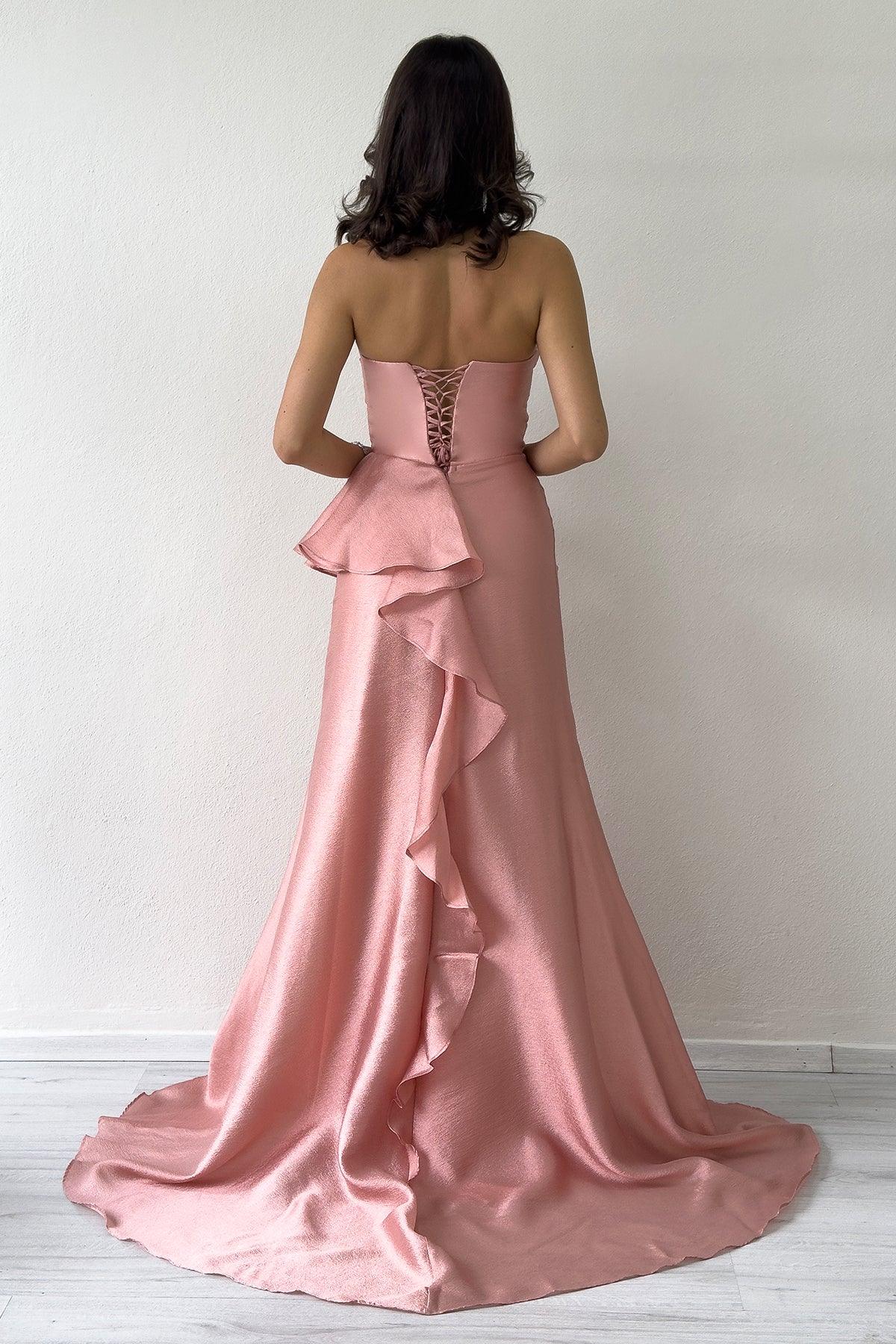 Kadın Pudra Straplez Drapeli Sırt Detay Volan Yırtmaçlı Abiye Elbise