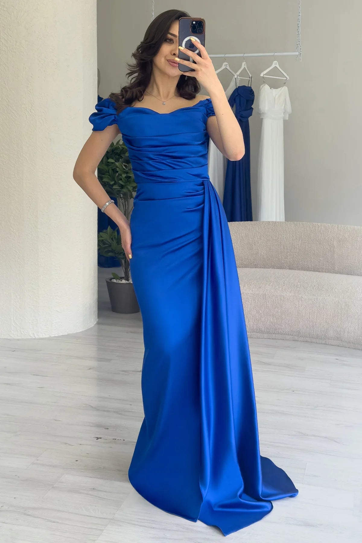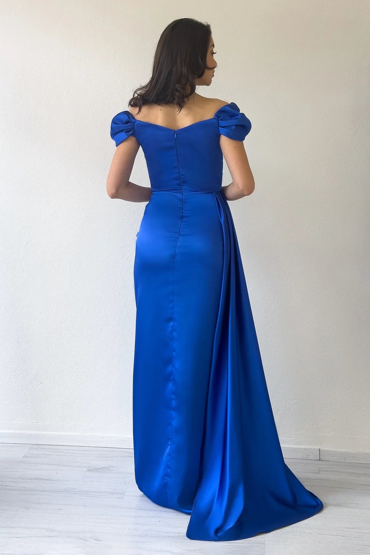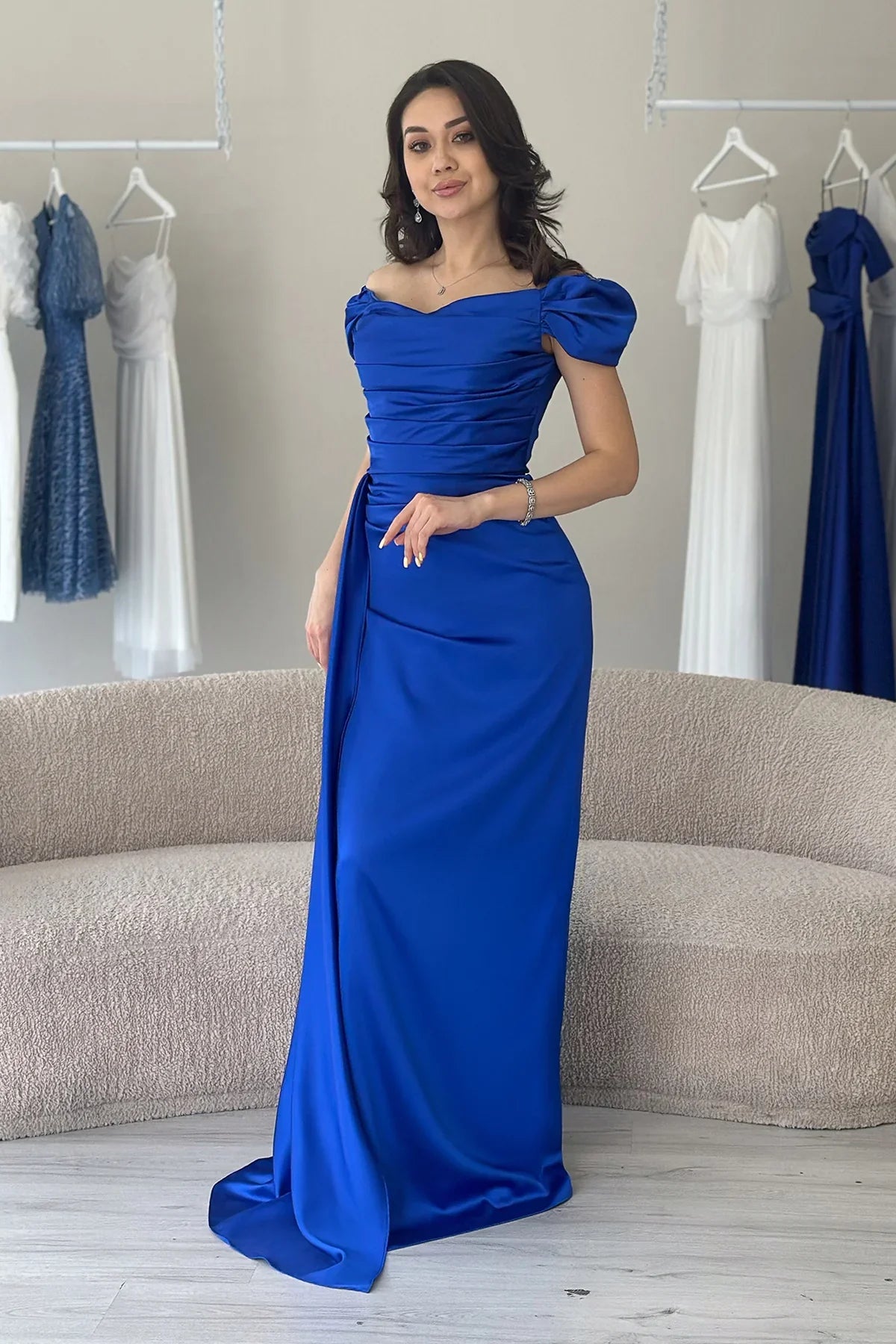 Kadın Saks Mavisi Düşük Omuz Saten Drapeli Yırtmaçlı Abiye Elbise
