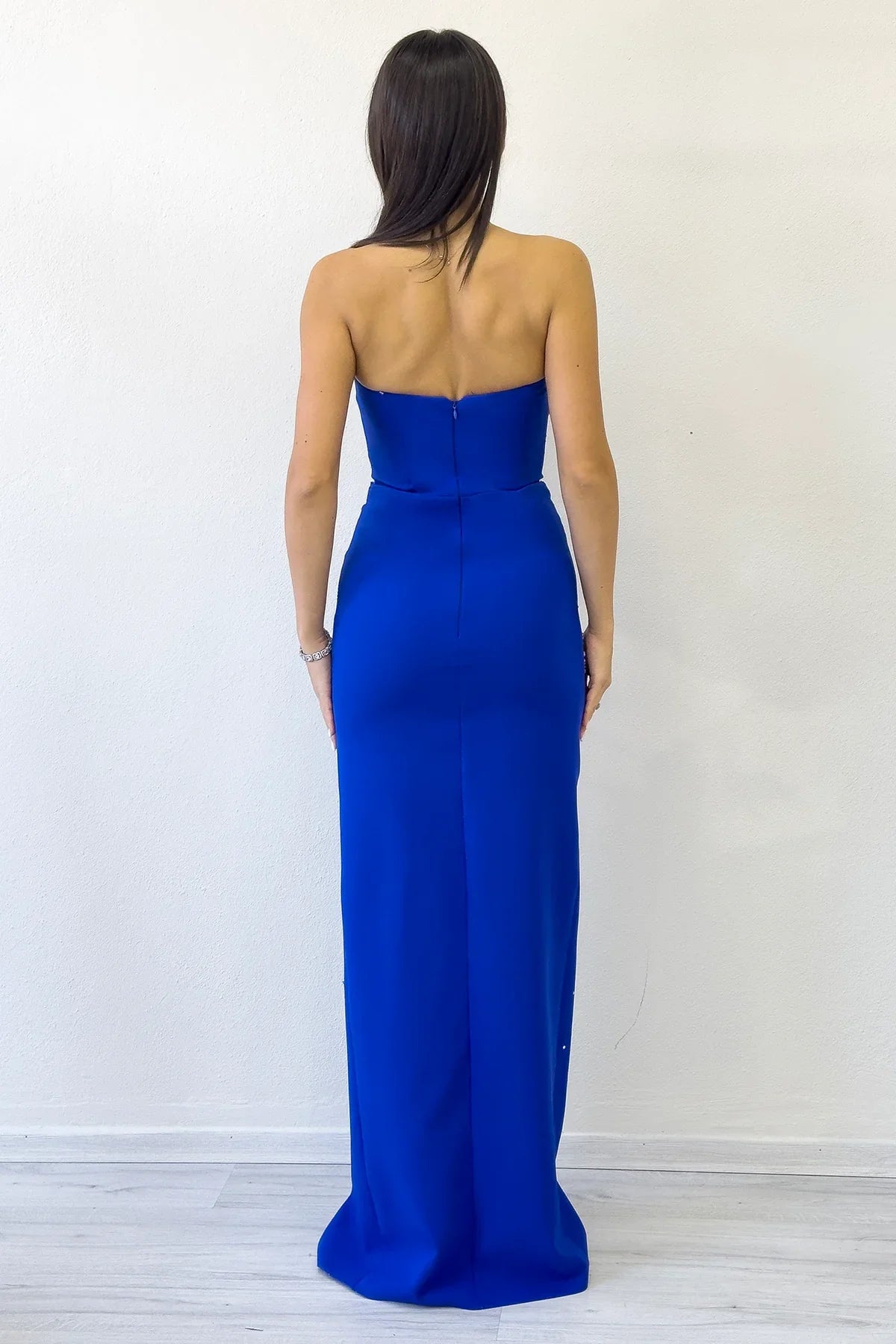 Kadın Saks Mavi Straplez Taş işlemeli Yırtmaçlı Abiye Elbise