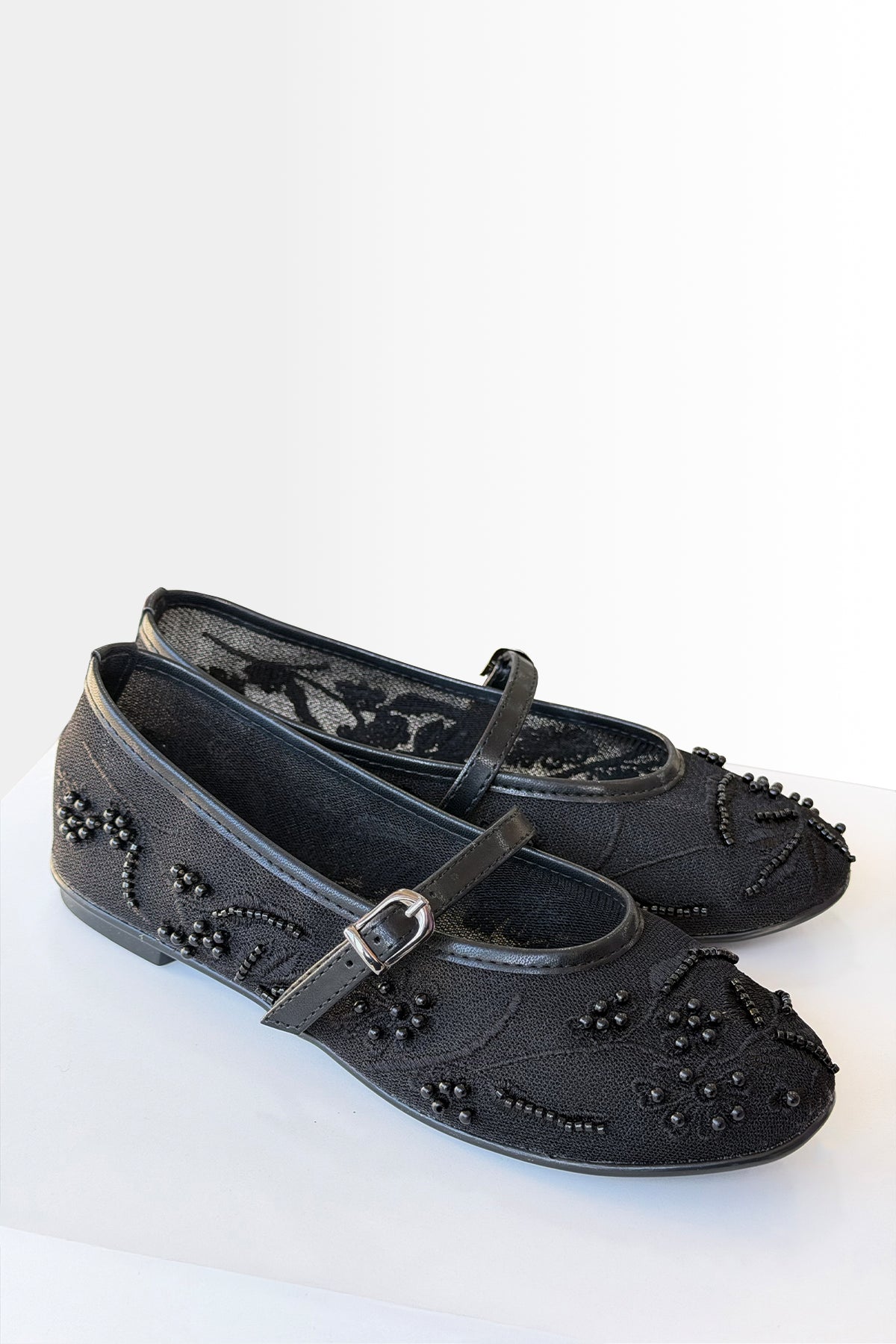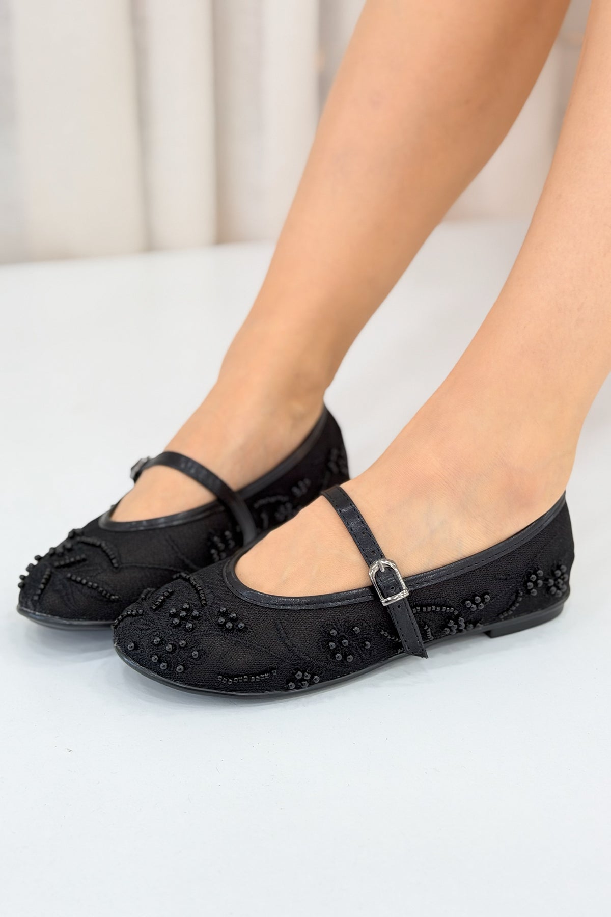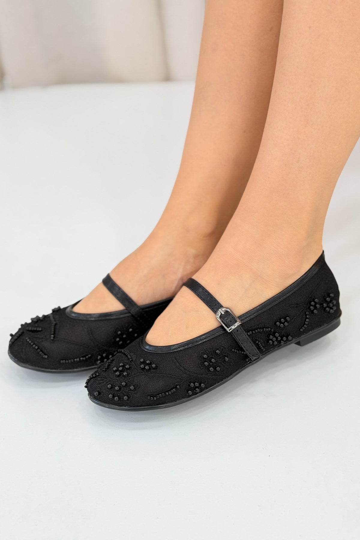 Kadın Siyah İnci Detaylı Transparan Babet