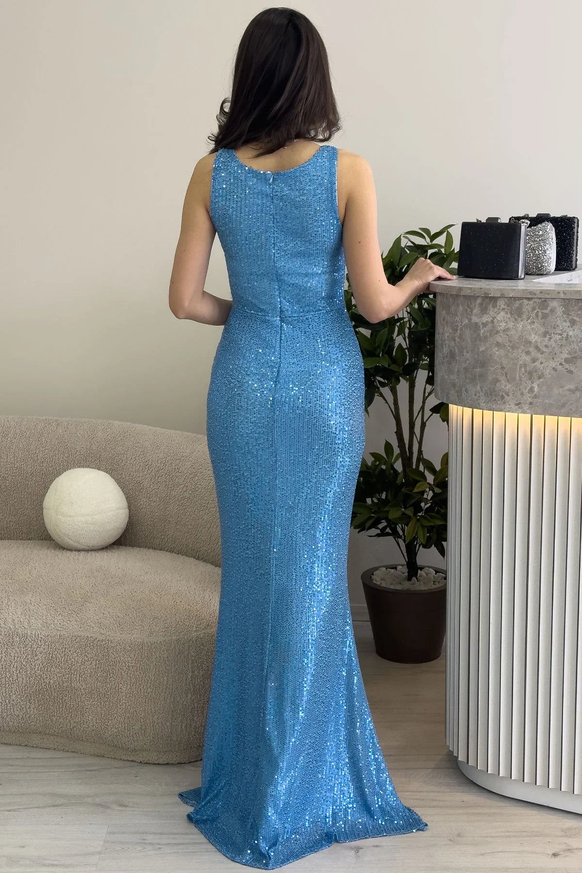 Kadın Turkuaz Askılı Yırtmaçlı Pul Payet Abiye Elbise