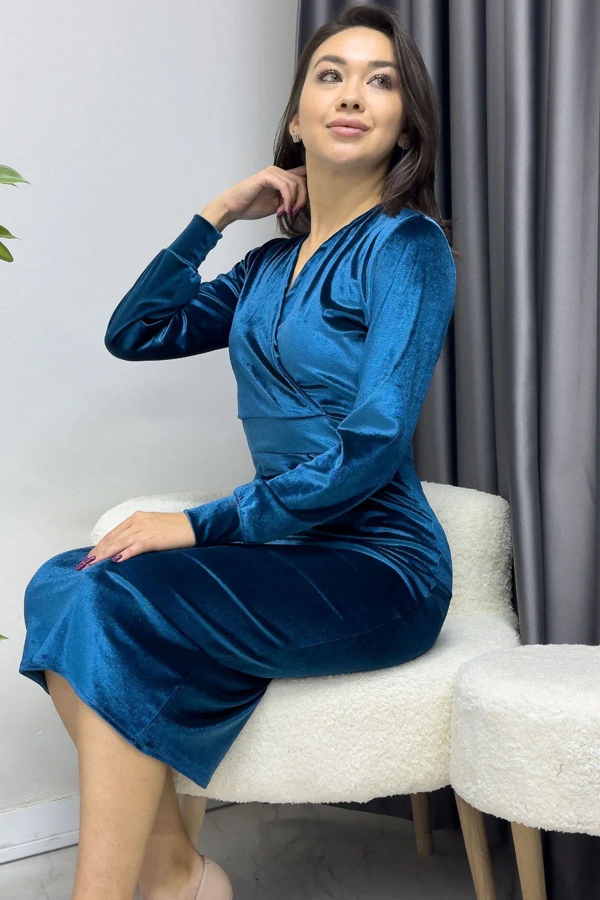Kadın Petrol Mavisi Midi Boy Kruvaze Büyük Beden Kadife Elbise