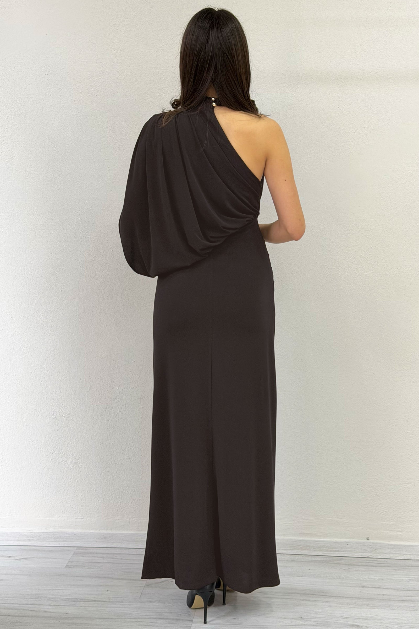 Kahverengi Tek Omuz Drape Detaylı Asimetrik Uzun Elbise