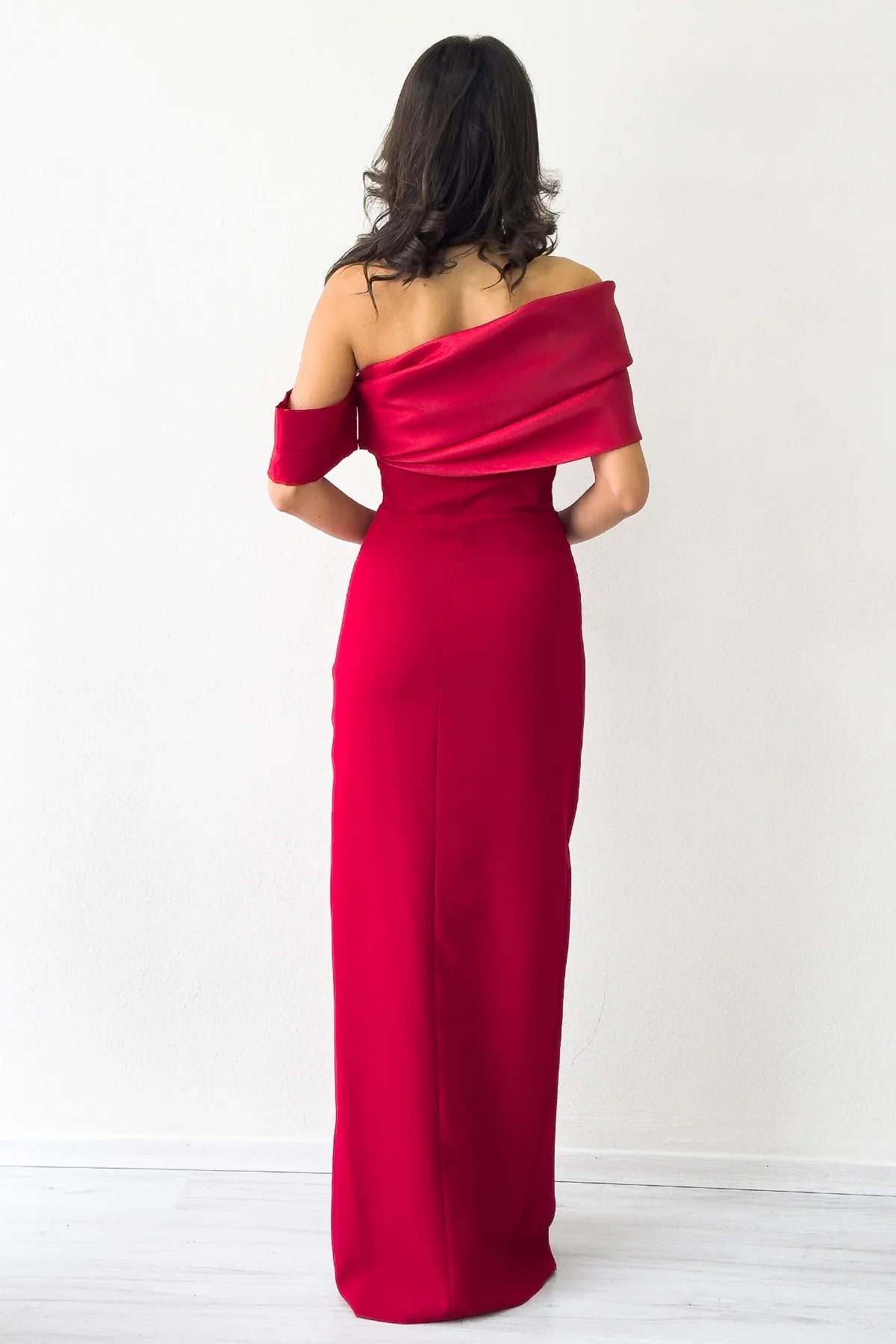 Kırmızı Drape Yaka Düşük Kol Yırtmaçlı Uzun Abiye Elbise