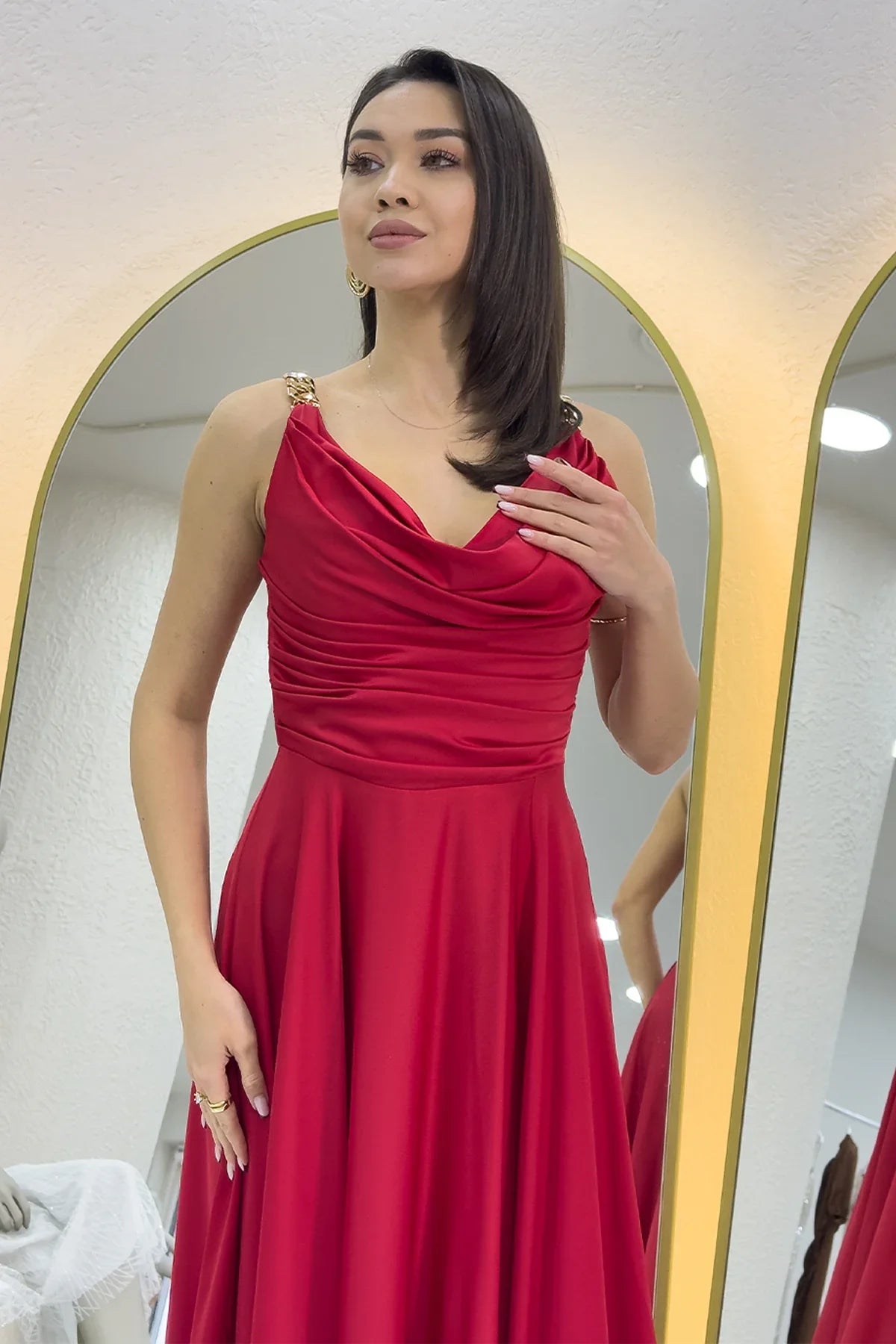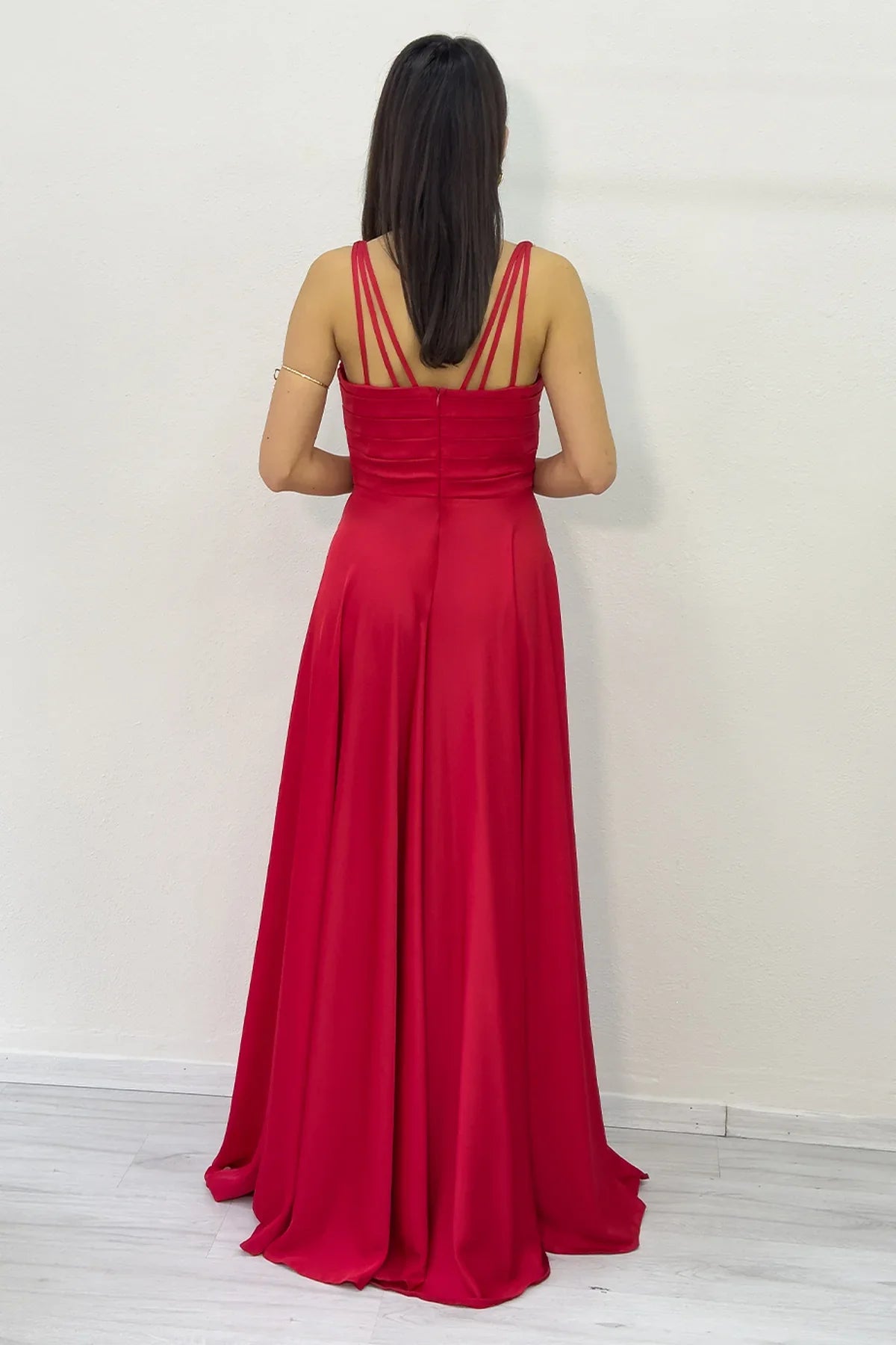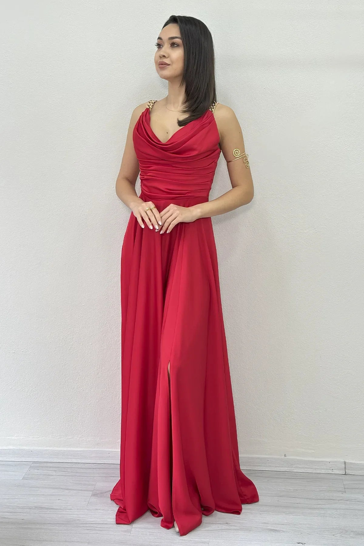 Kırmızı Gold Askılı Ön Drapeli Saten Yırtmaçlı Abiye Elbise