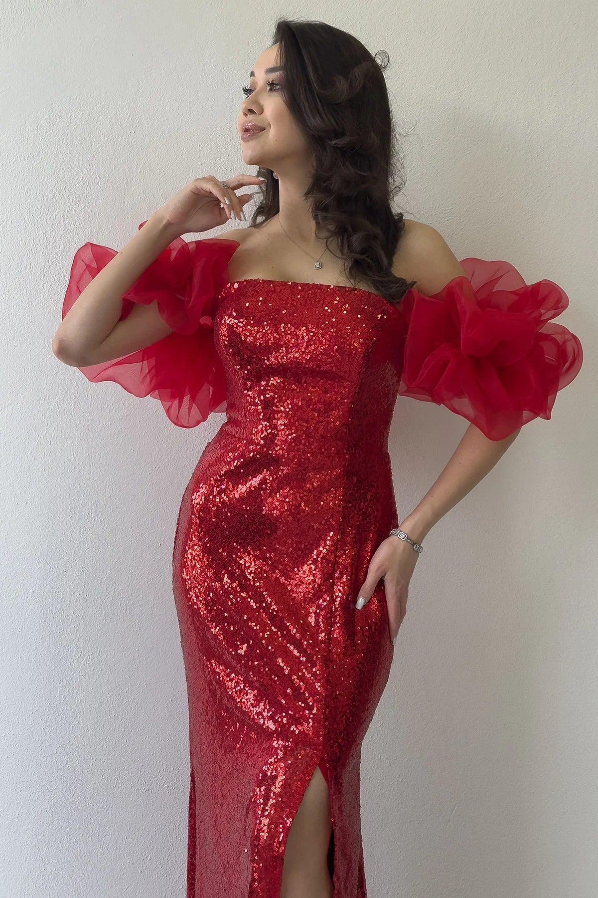 Kırmızı Straplez Pul Payet Yırtmaçlı Tül Kol Detaylı Abiye Elbise