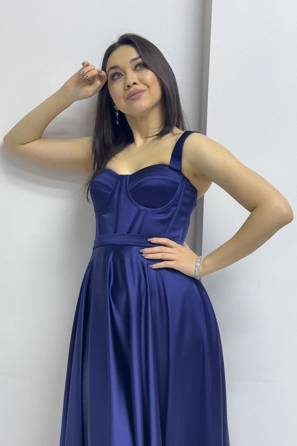 Lacivert Gloplu Sırtı Bağcıklı Saten Askılı Midi Abiye Elbise