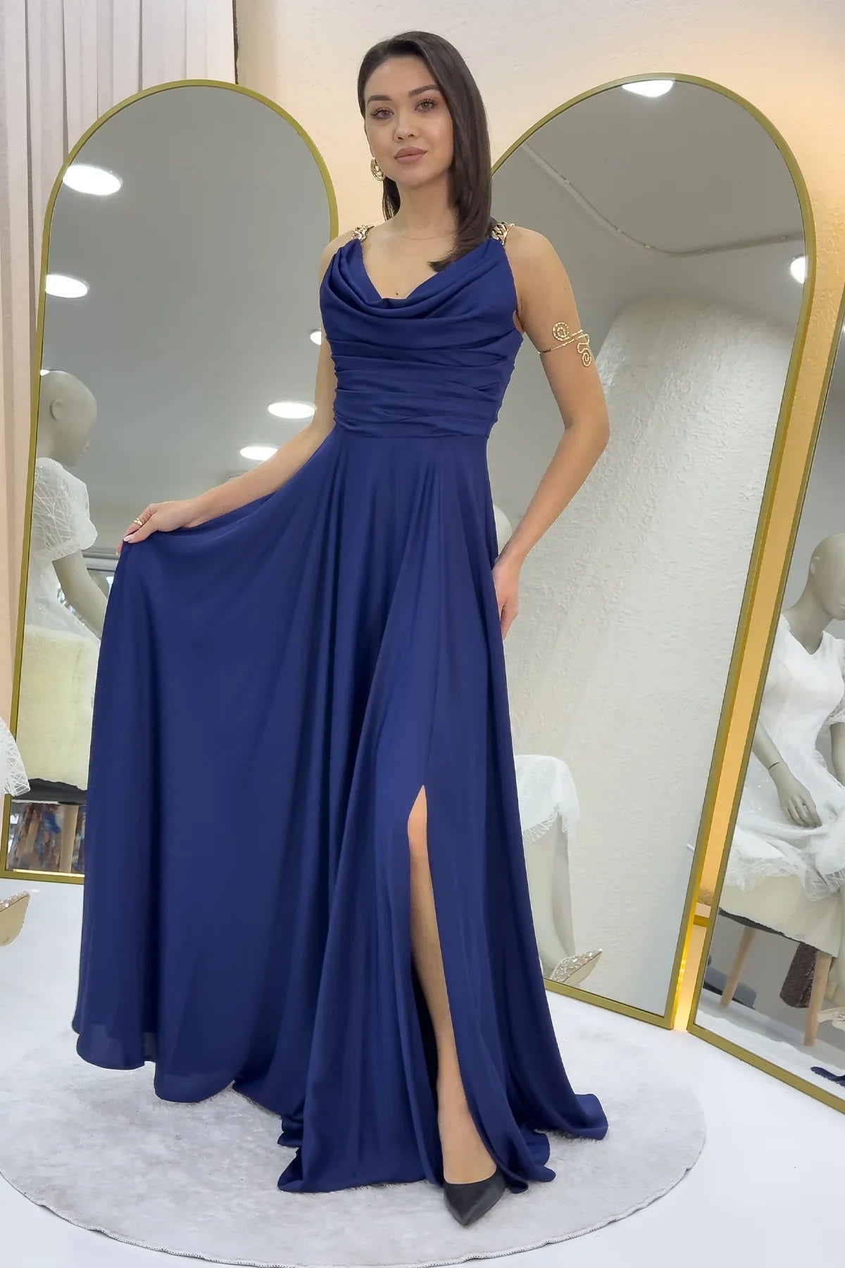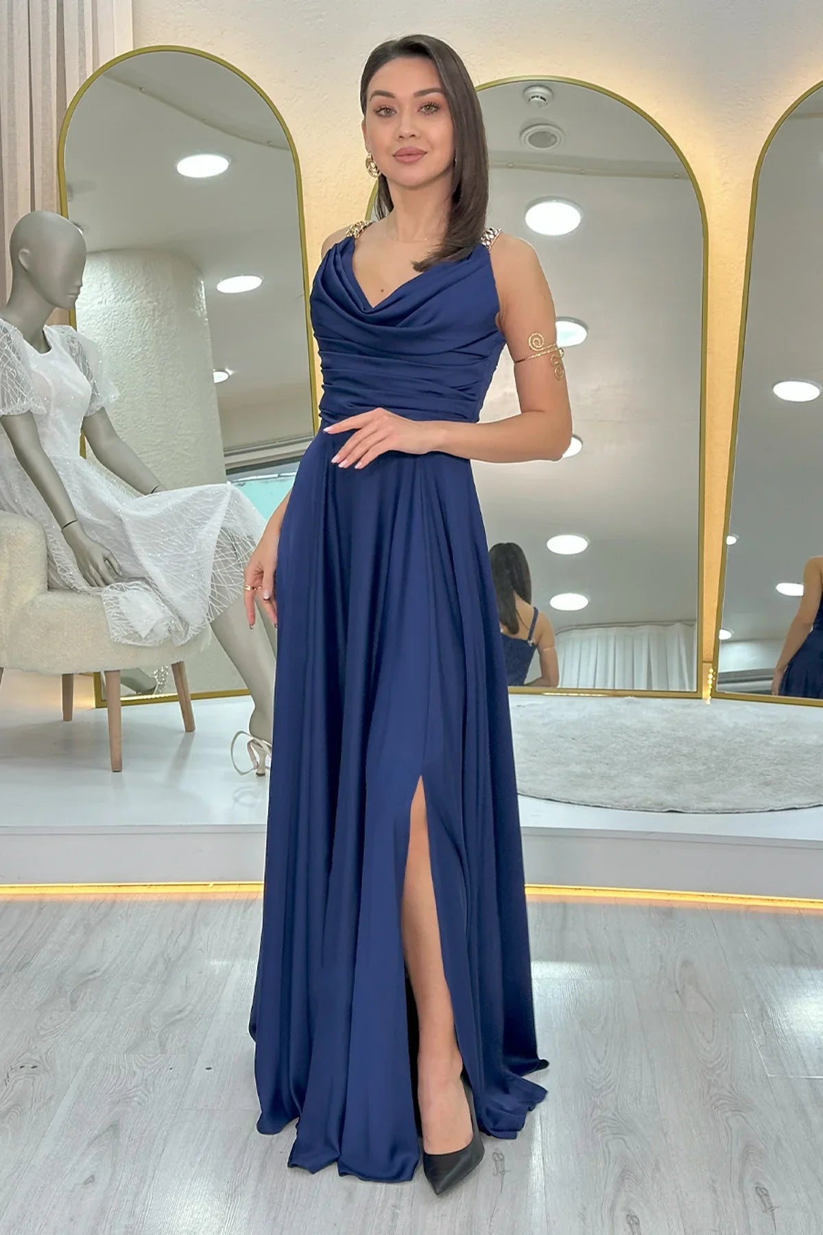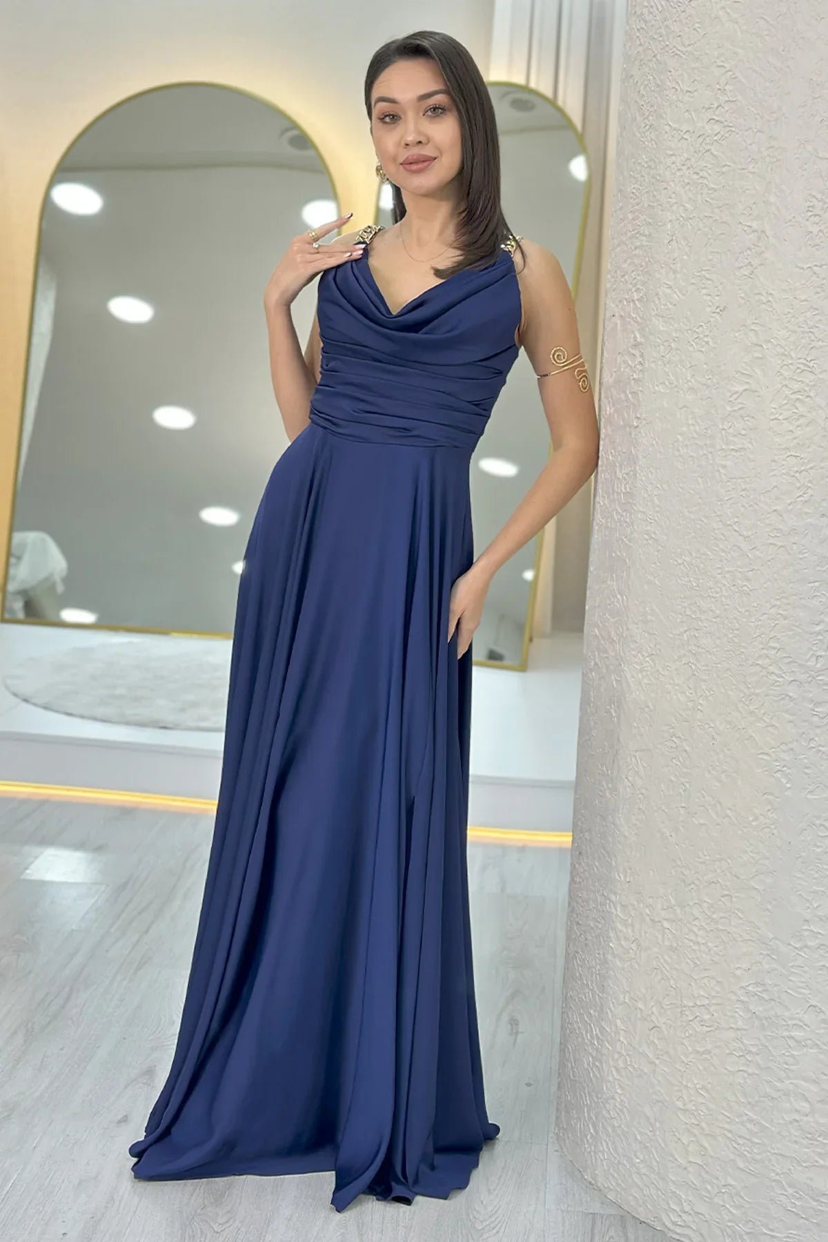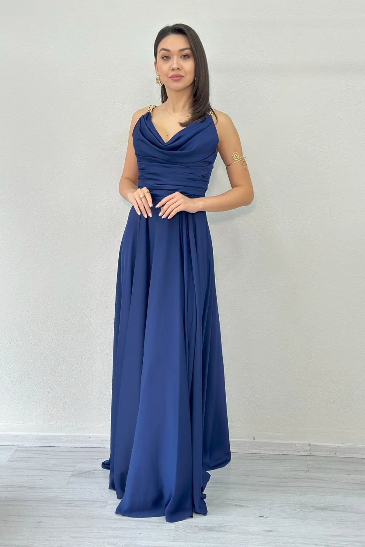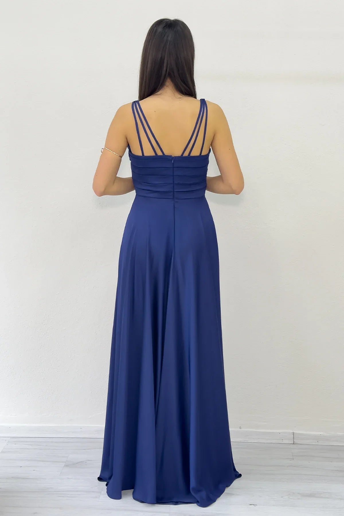 Lacivert Gold Askılı Ön Drapeli Saten Yırtmaçlı Abiye Elbise