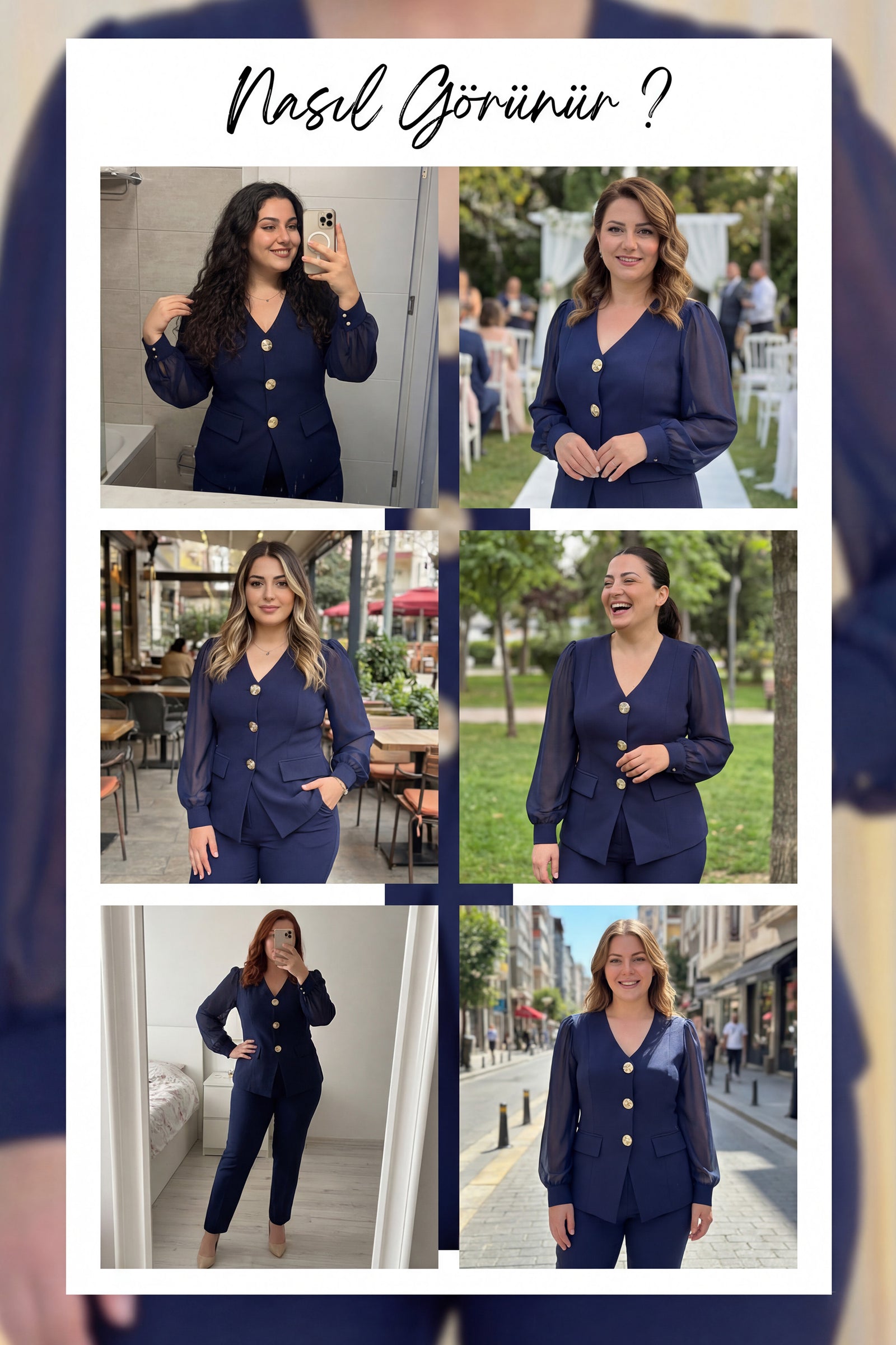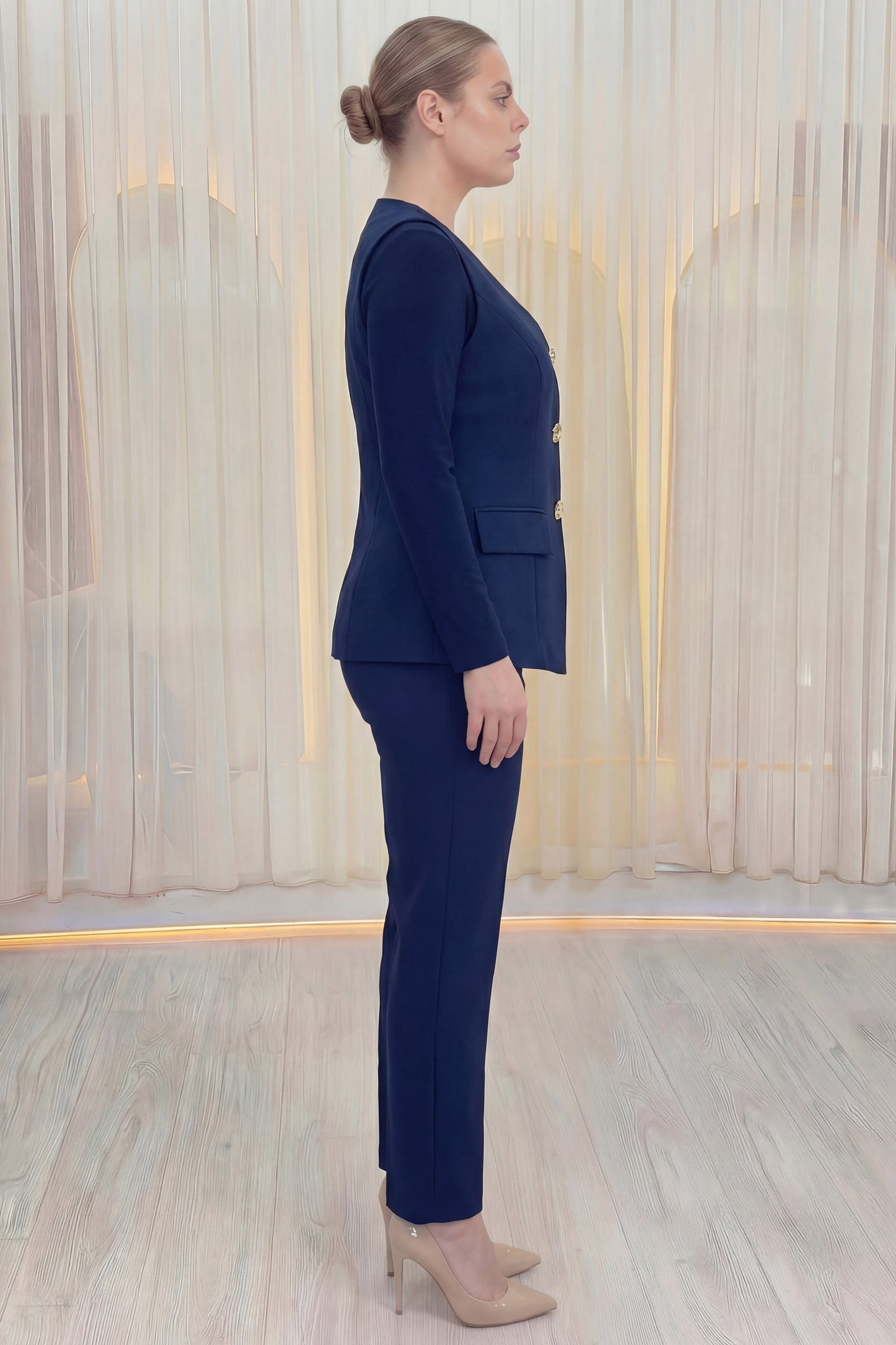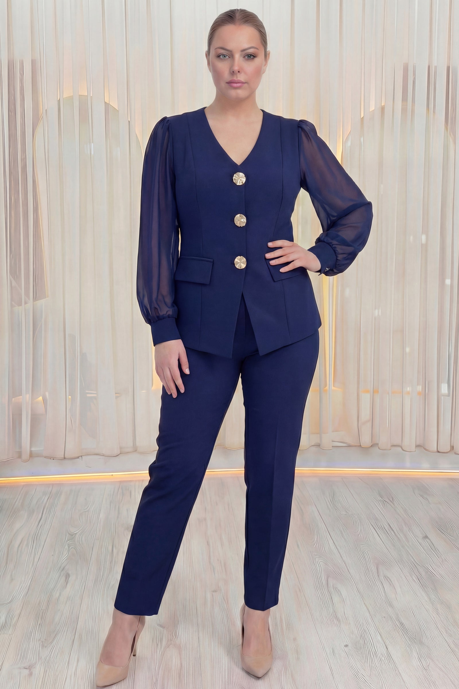 Lacivert Gold Düğmeli Şifon Kol Büyük Beden İkili Takım