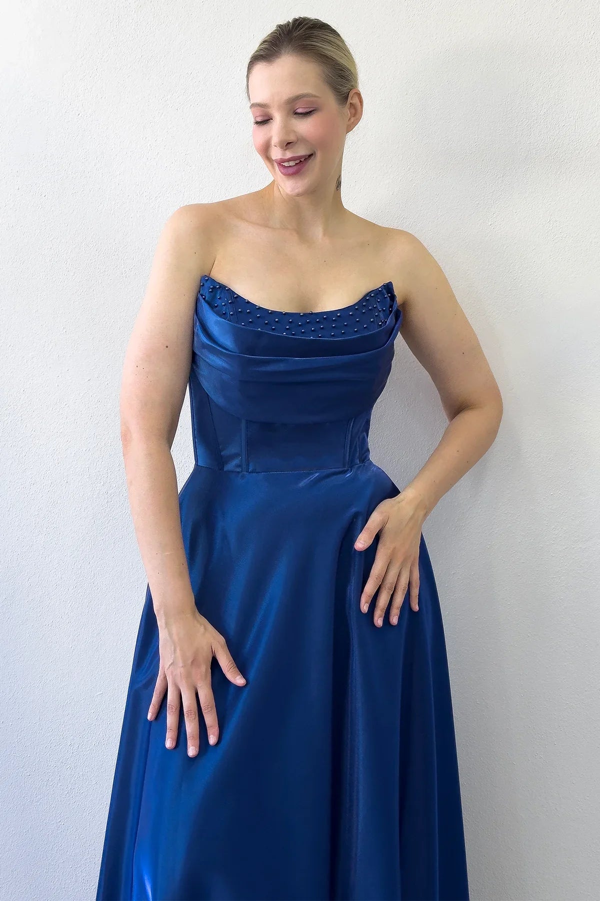 Lacivert Straplez Korse Detaylı Boncuklu Sırt Dekolteli Abiye Elbise