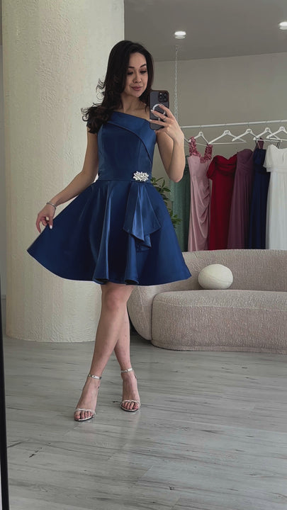 Lacivert Tek Omuz Taş Detay Mini Kloş Saten Abiye Elbise