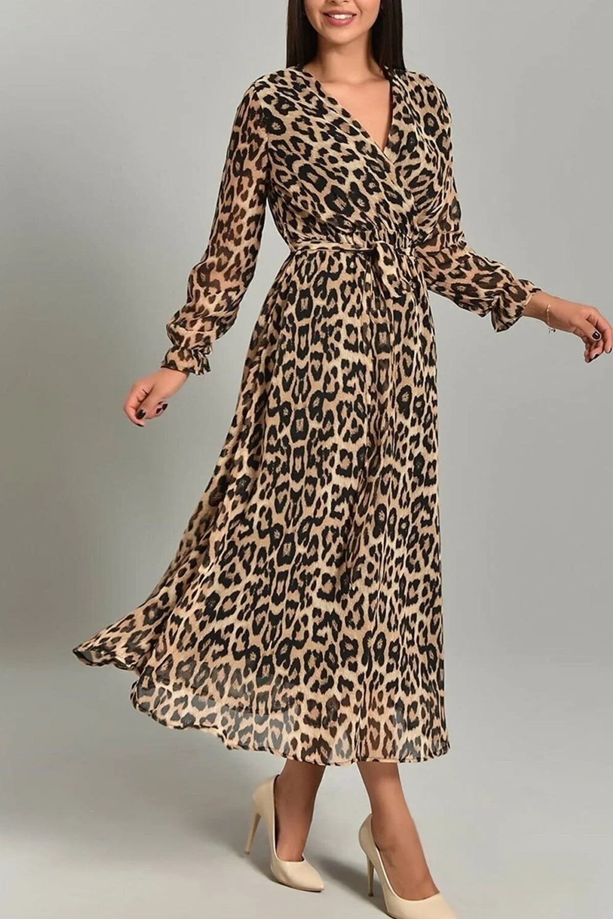 Leopar Desenli Kruvaze Yaka Şifon Büyük Beden Elbise