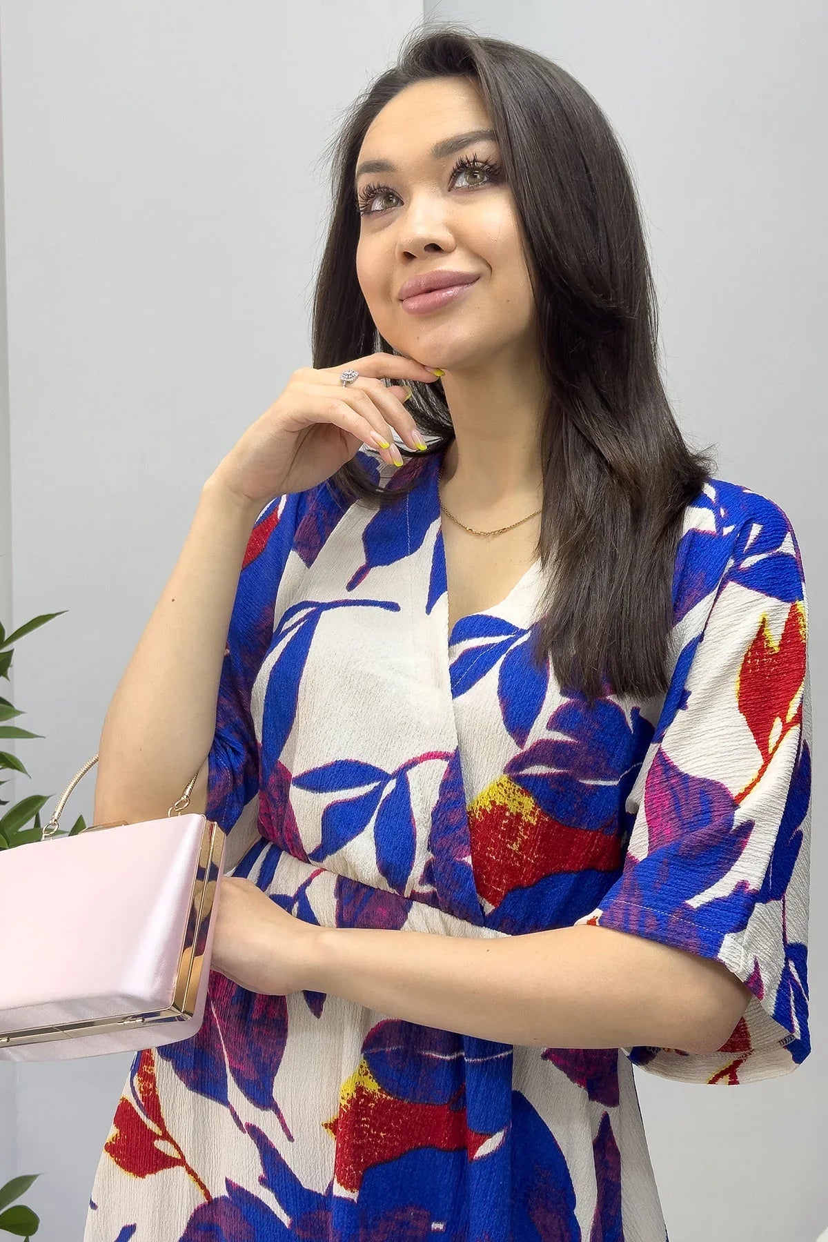 Mavi Yaprak Desen Yarasa Kol Midi Elbise