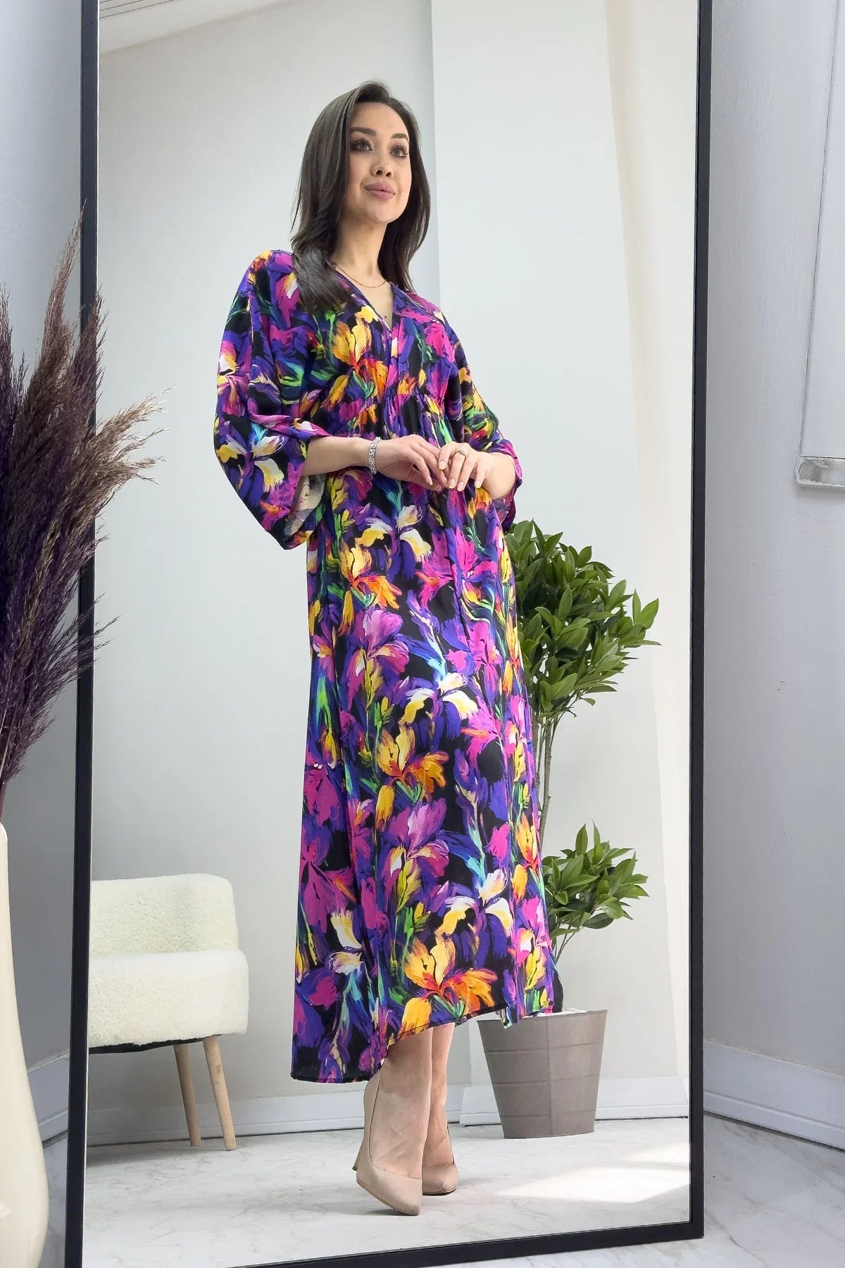 Mor Çiçek Desenli Viskon Yazlık Elbise