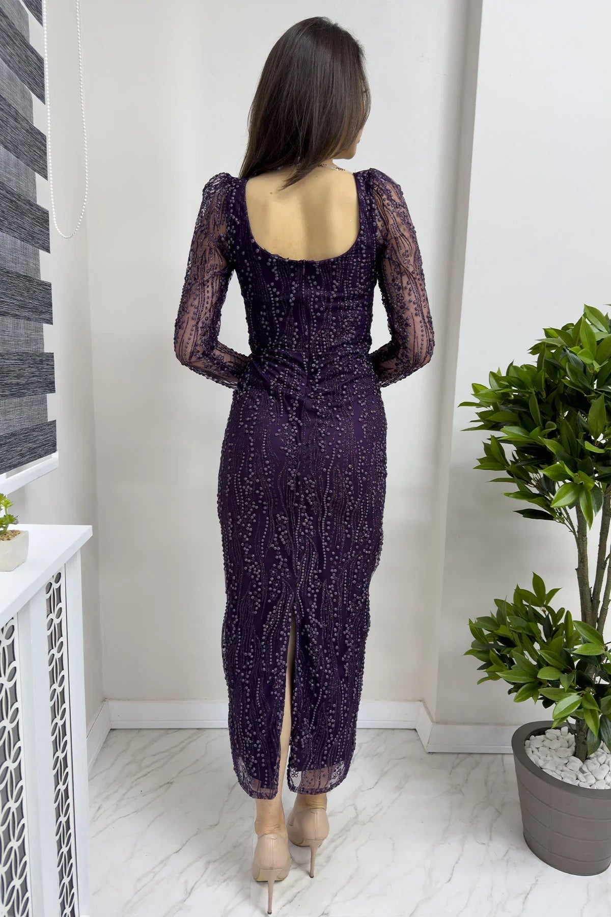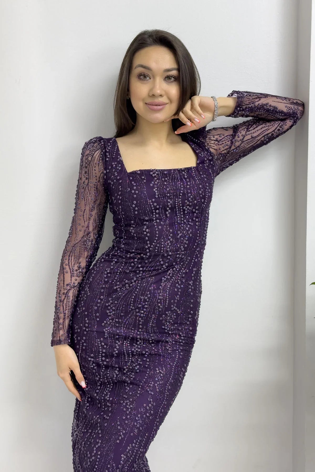 Mor Kare Yaka Simli Uzun Kol Midi Abiye Elbise