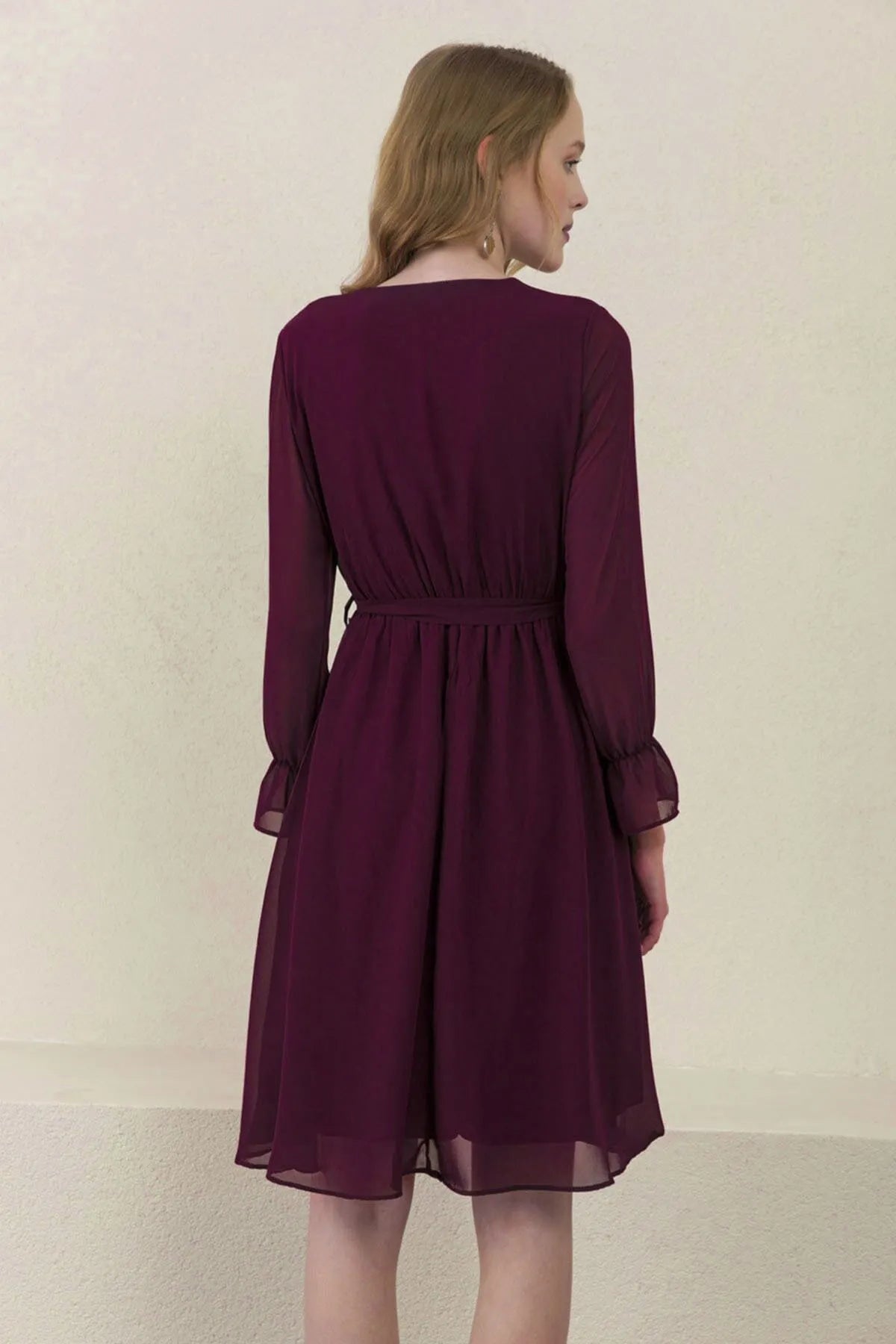 Mor Kruvaze Yaka Şifon Büyük Beden Kısa Elbise