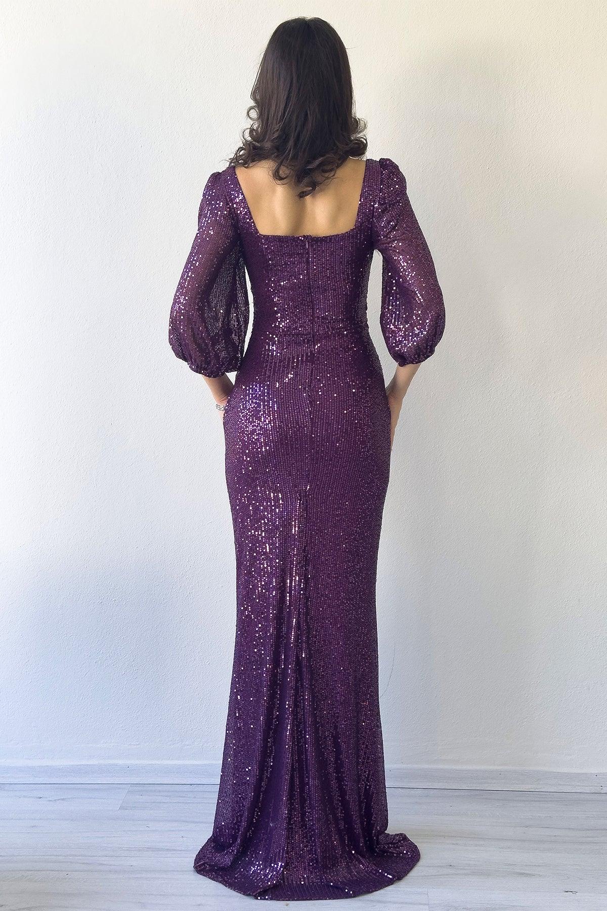 Mürdüm Pul Payet Ön Büzgülü Balon Kol Yırtmaçlı Büyük Beden Abiye Elbise