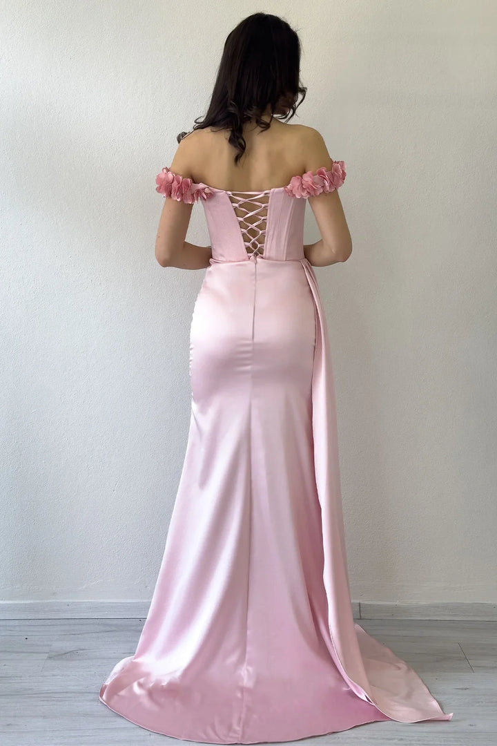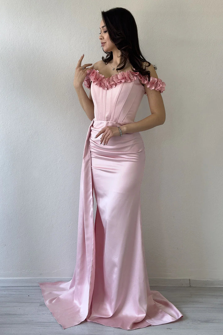 Pudra  Çiçekli Kayık Yaka Drapeli Yırtmaçlı Saten Abiye Elbise